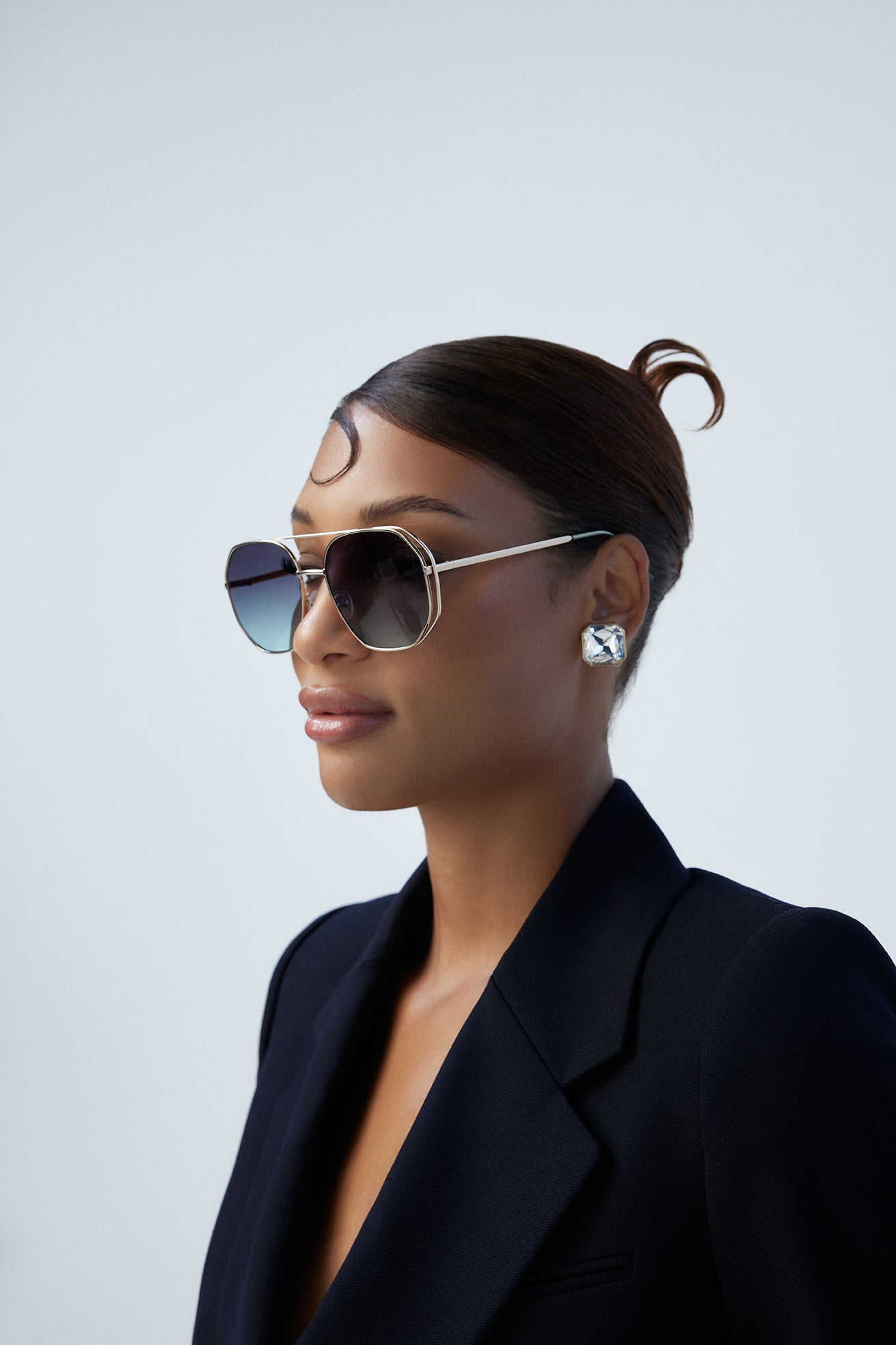 Ladies oversized metal rounded Aviator sunglasses with cut out detail on side on lenses.