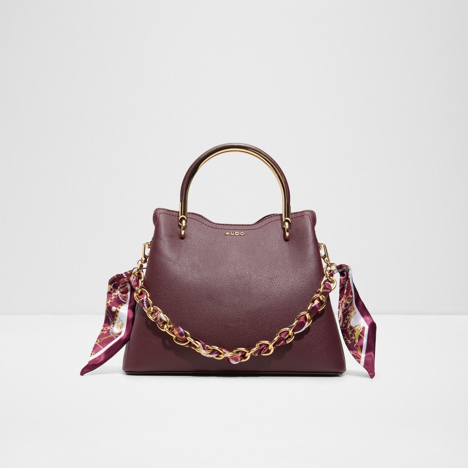 Boxy and bold, this structured satchel features an eye-catching strap and chainlink scarf detail for a femme touch.