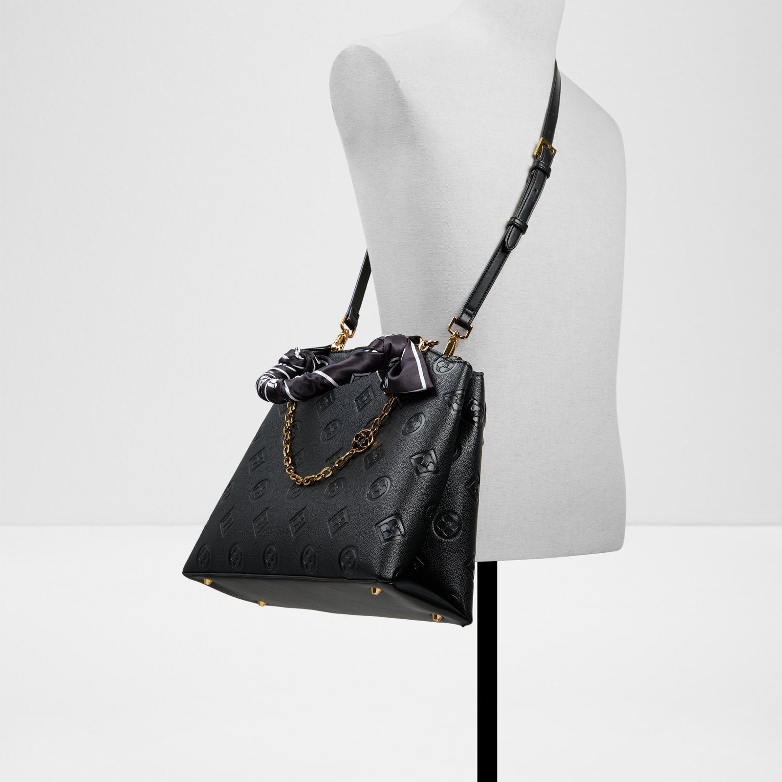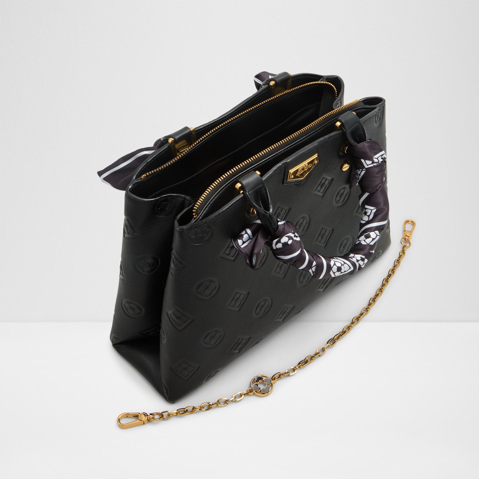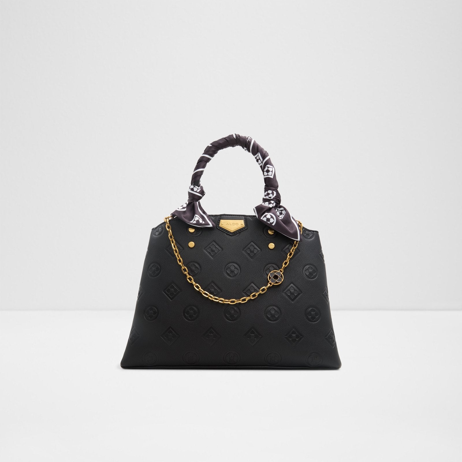 Elegant handbag with embossed monogram, gold chain, and scarf-wrapped handles—sophisticated and stylish!