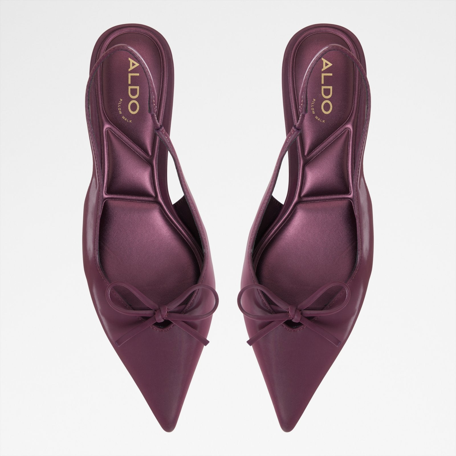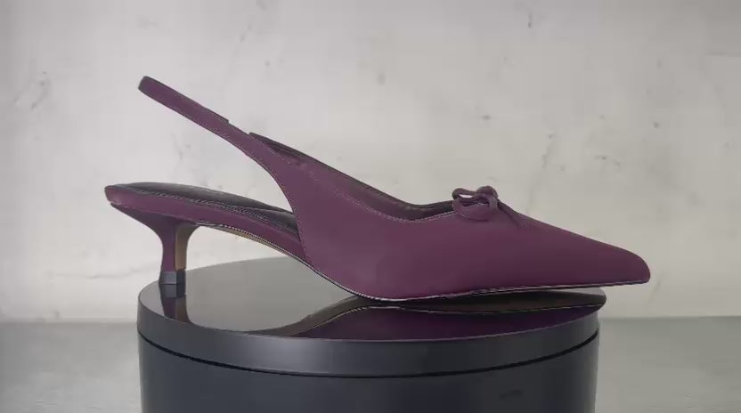 Bows adorn this high-shine slingback style designed with an of-the-moment kitten heel and super sleek pointed toe.