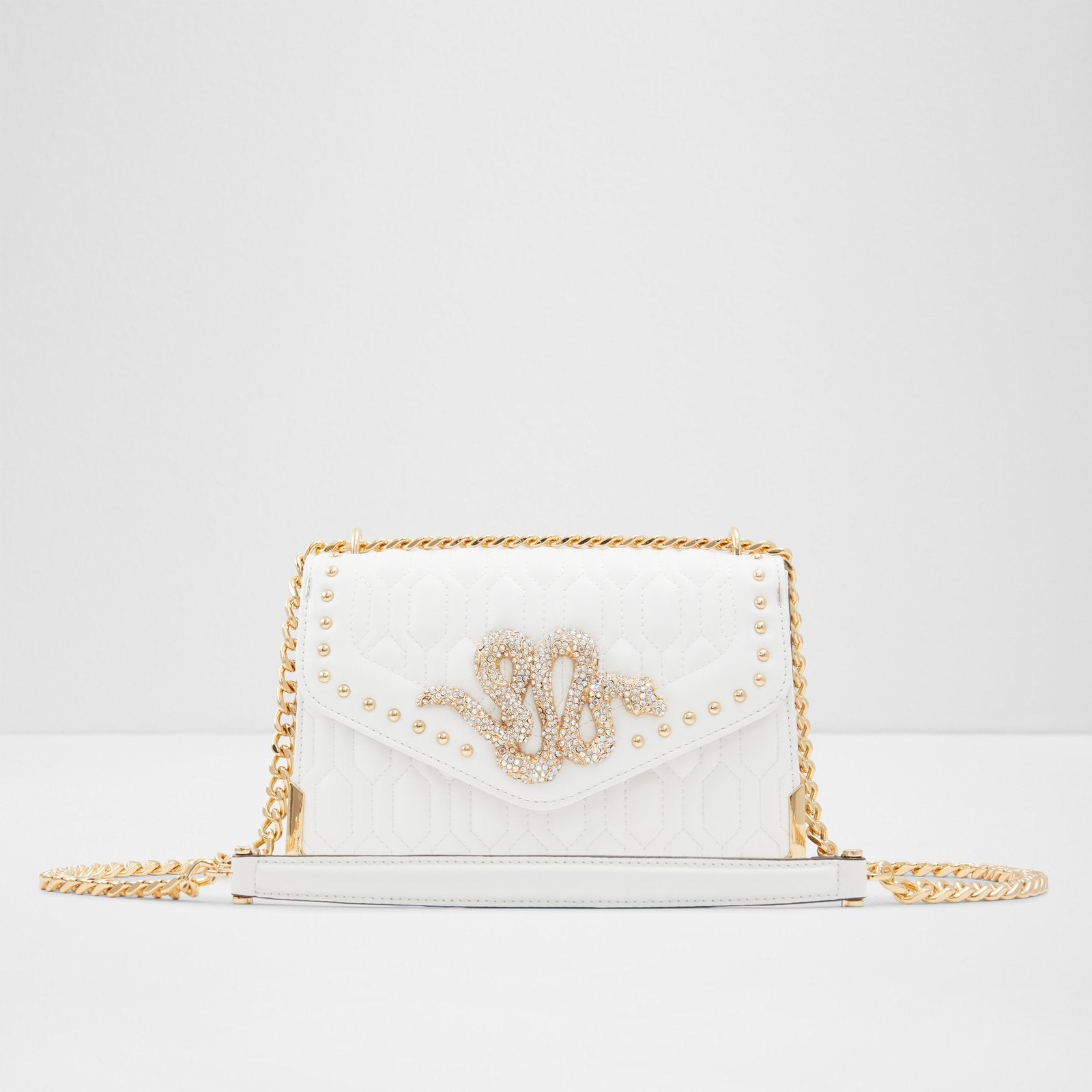 Ladies ALDO COLLECTION US medium size quilted glam crossbody with metal statement snake component with rhinestones and metal feet detailing.