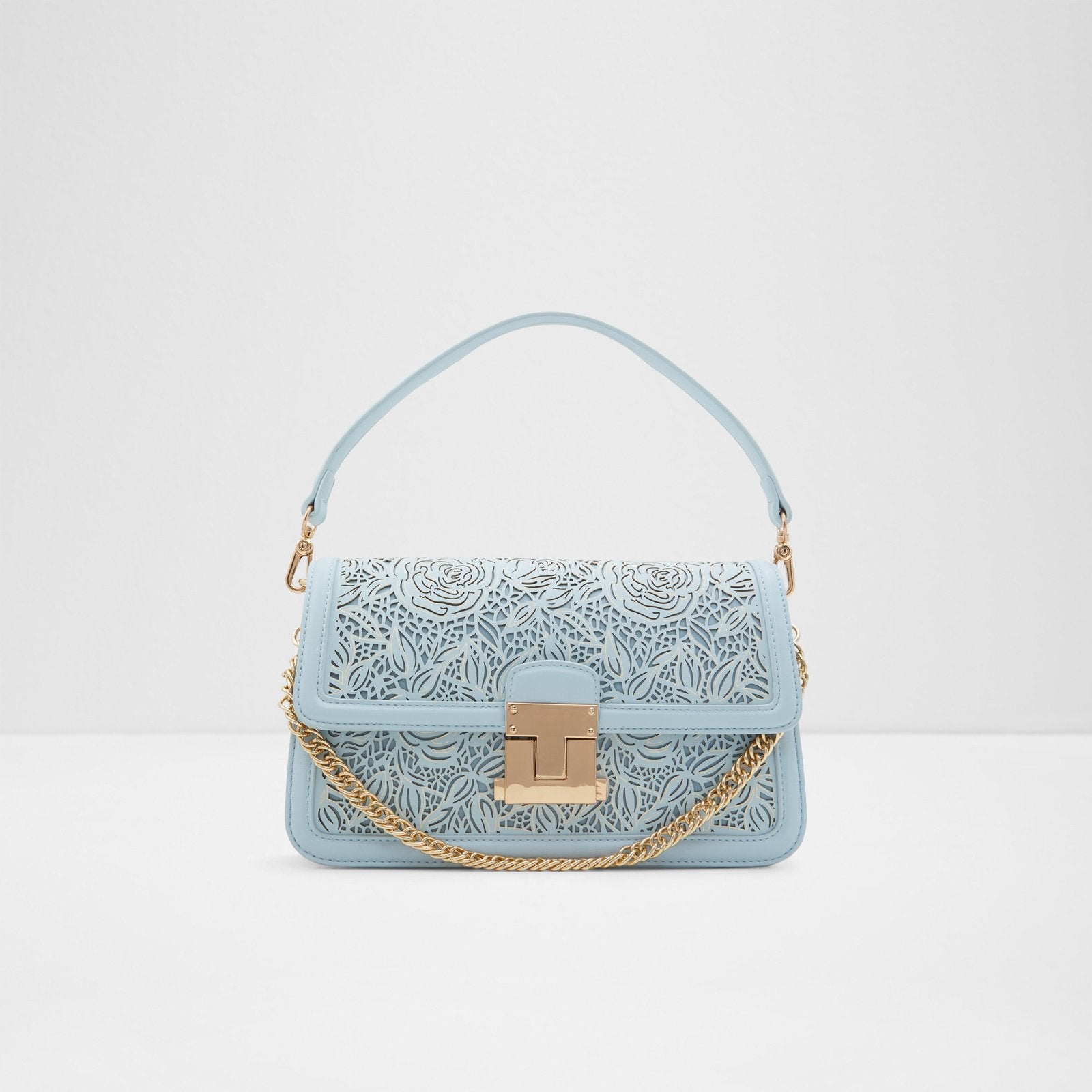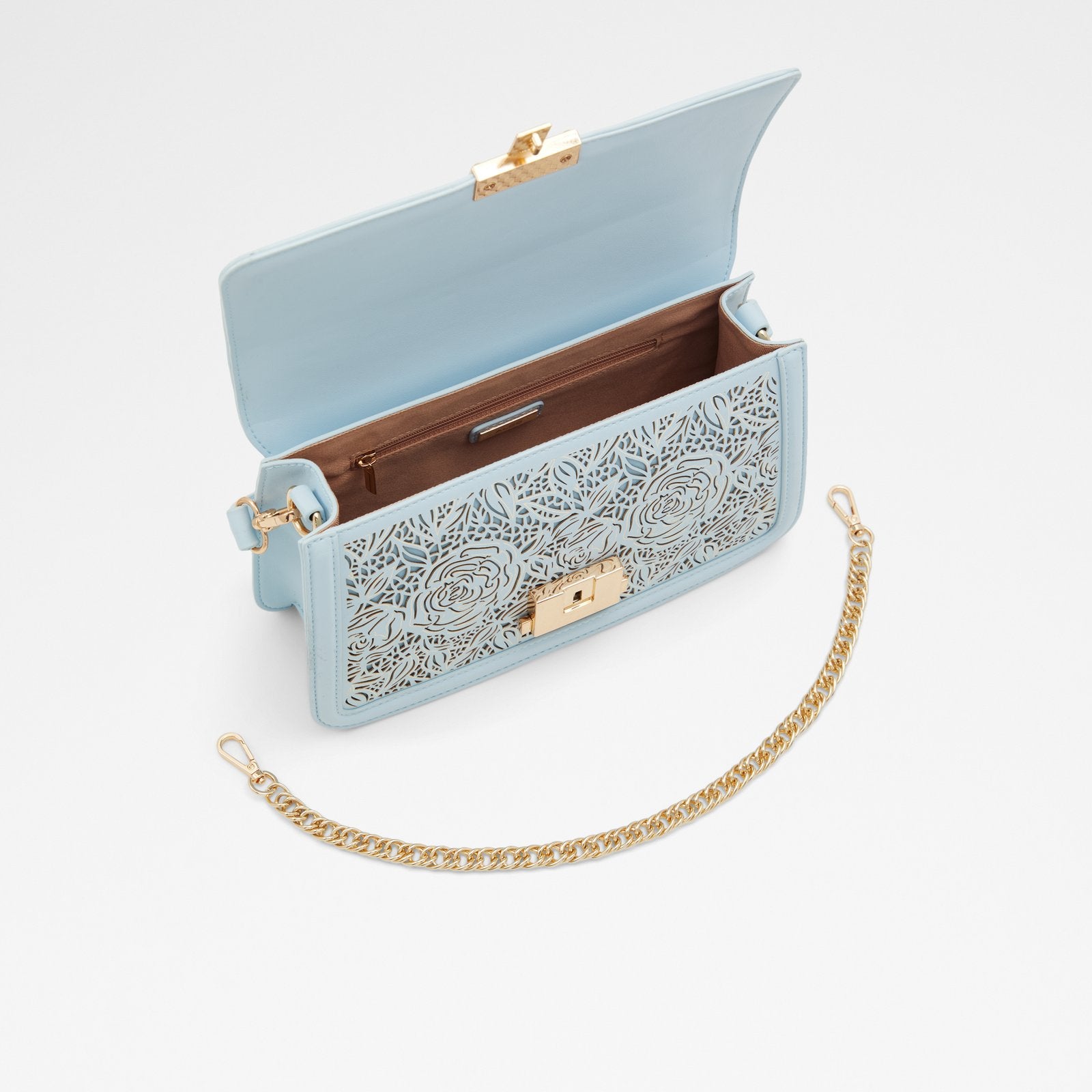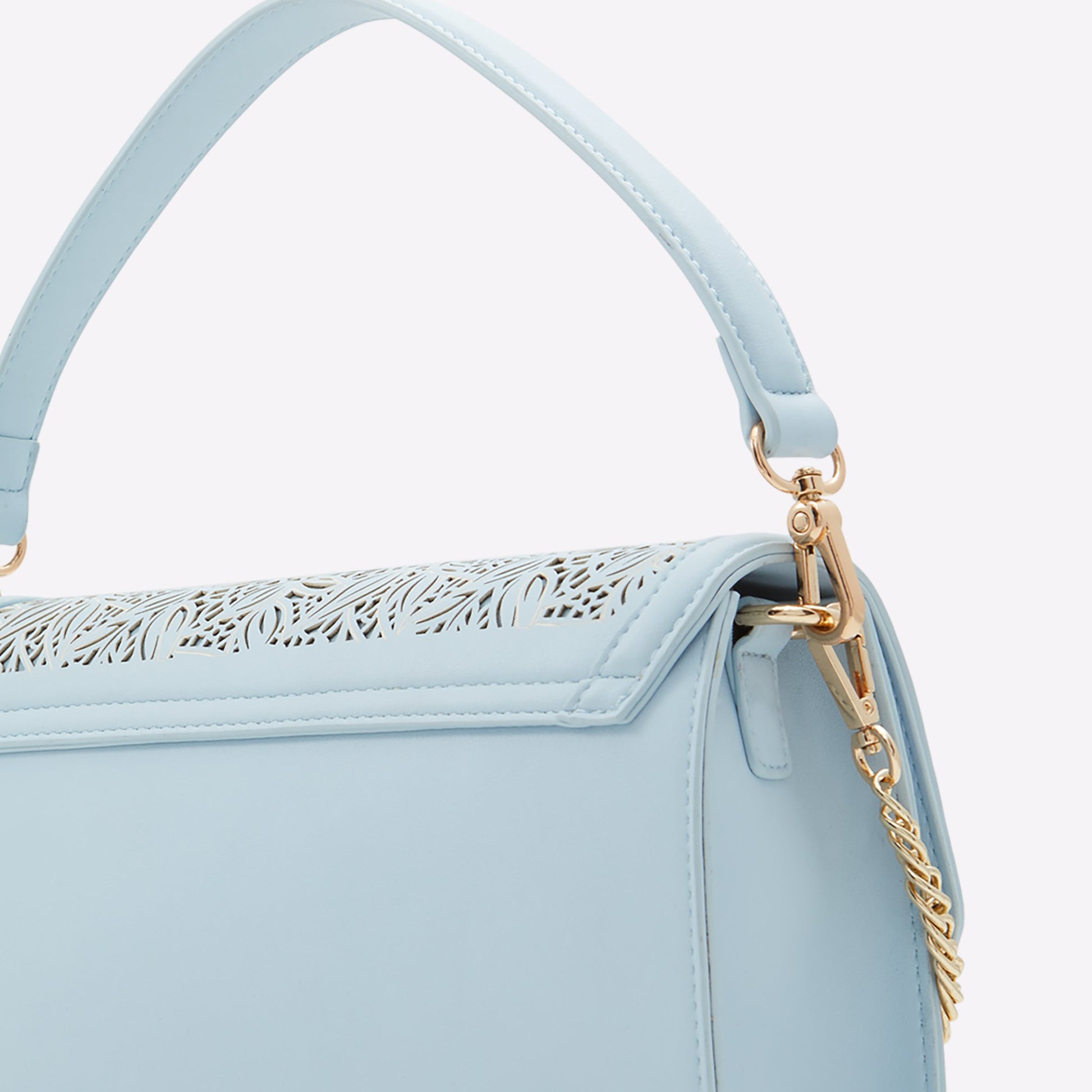 Ladies medium size laser cut shoulder bag with non-removable chain strap detailing and added crossbody strap.