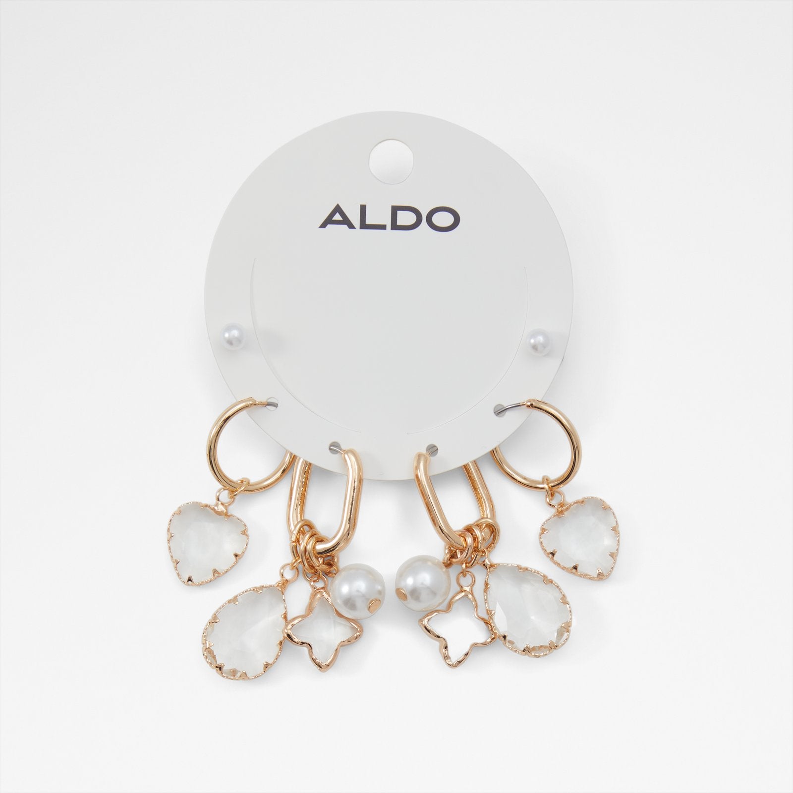 This elegant gold earring set features delicate pearl detailing, perfect for adding a sophisticated touch to any occasion.