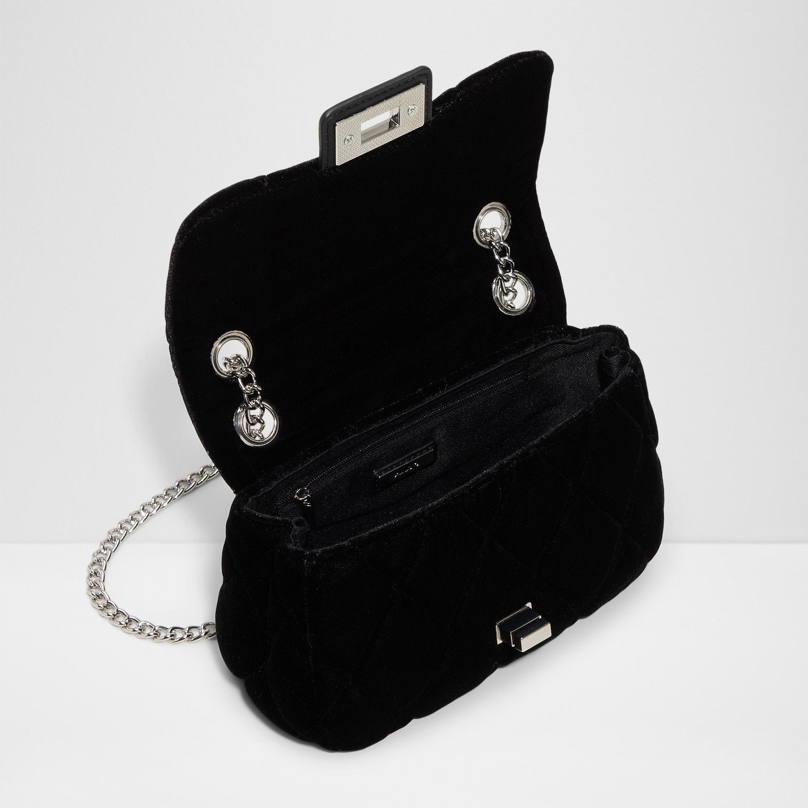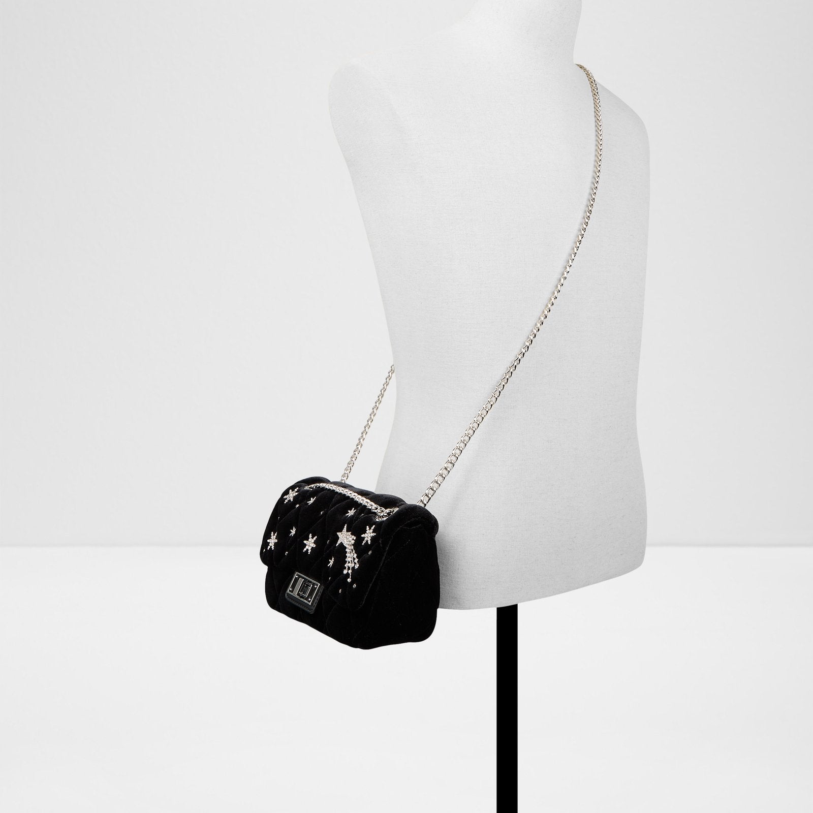 Soft velvet and polished silver hardware elevate this crossbody style, while a turn lock closure and eye-catching ornament make it a statement piece.