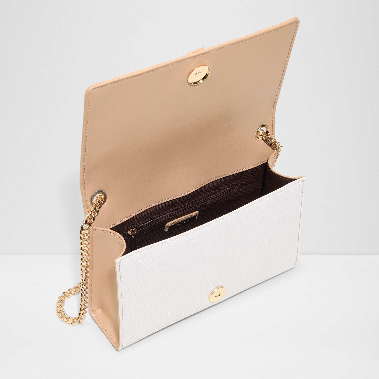 This crossbody bag features a clean, structured silhouette with a magnetic snap closure and refined metal plating for a polished finish. Designed with a single compartment, it offers a streamlined, versatile option for everyday wear.