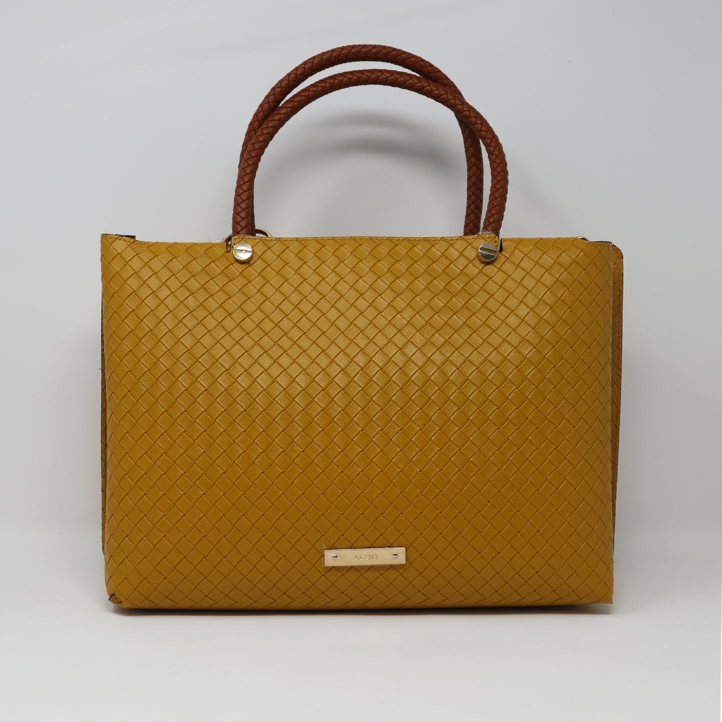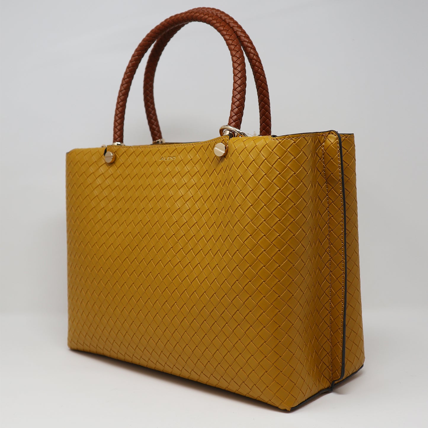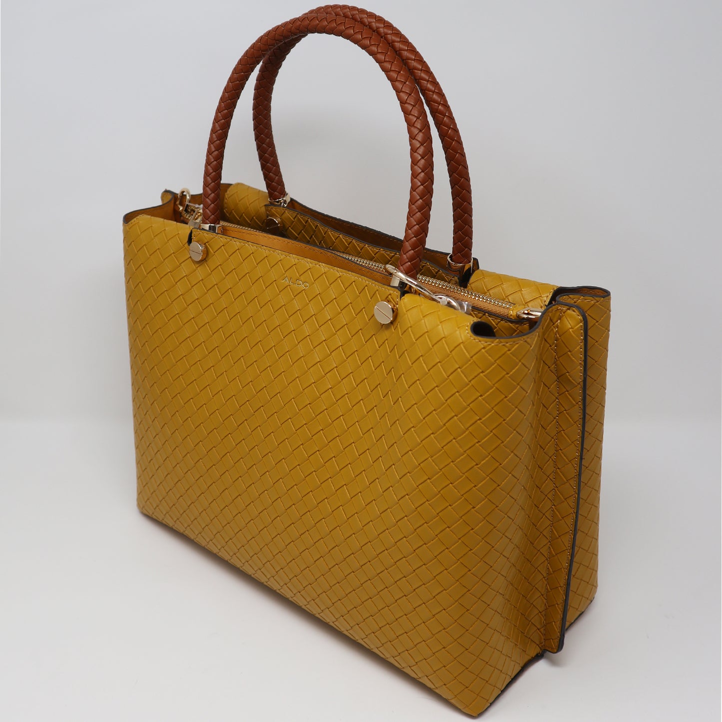 Ladies tote with non-removable keyfob with hanging tassel and braided handle detailing
