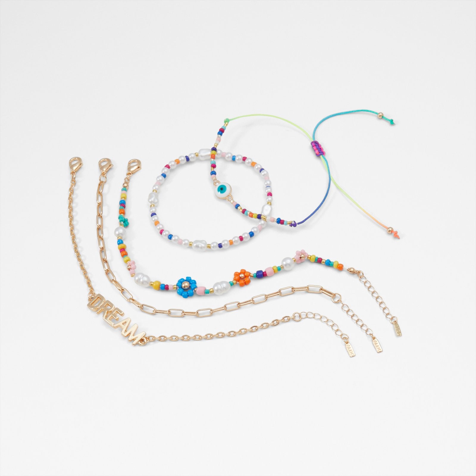 A trendy multi-pack of beaded bracelets, featuring a gold-accented piece and one with a "Dream" charm. Perfect for stacking and adding a meaningful touch to your look.