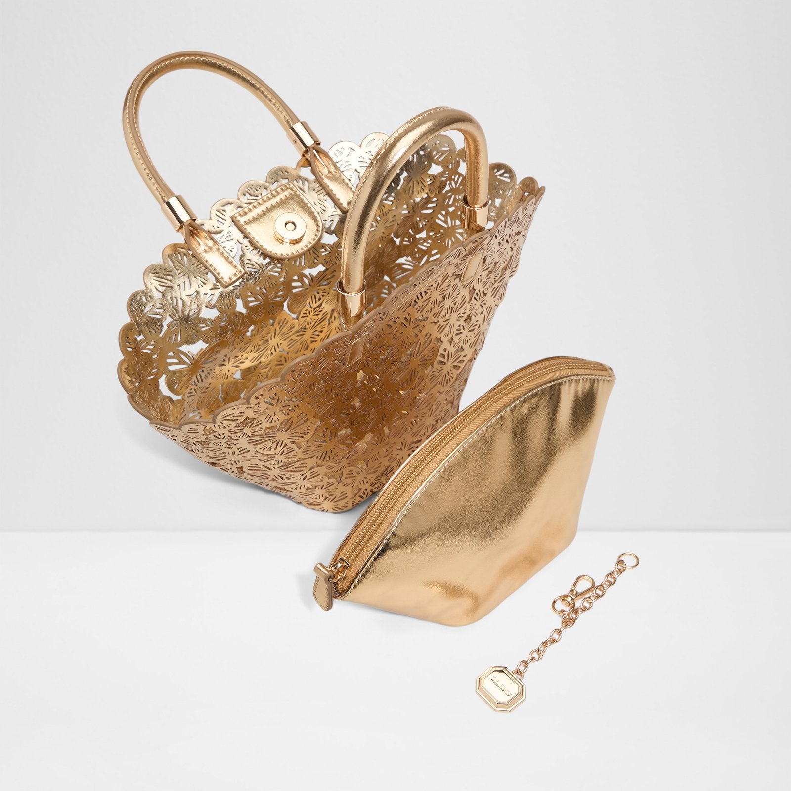 Perfect for that special evening out, this gold-tone Elegenta satchel handbag with mini pouch accessory makes looking great and staying organized, a snap.