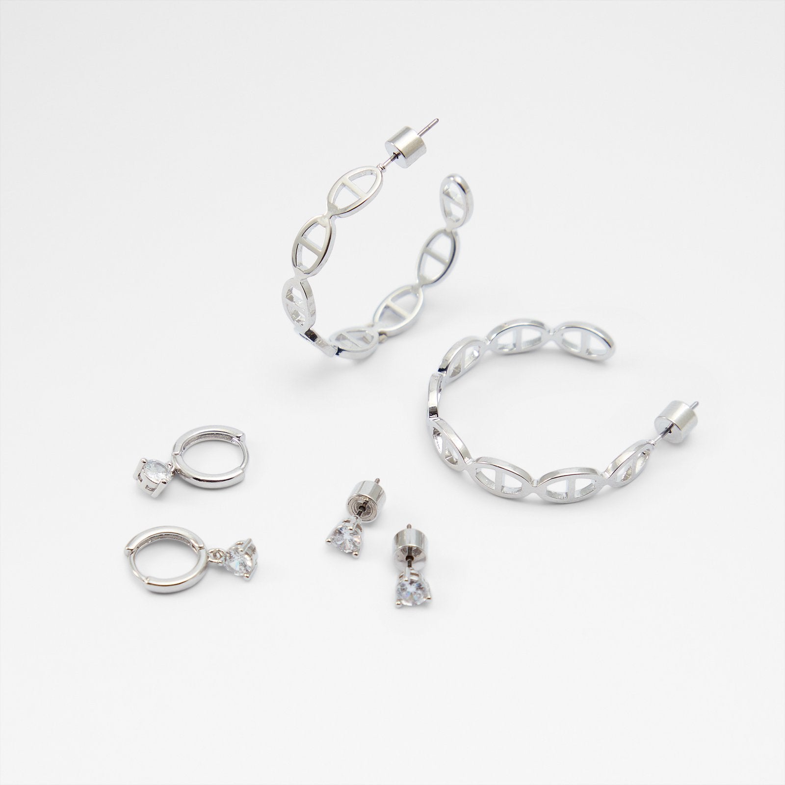 This set of three silver hoop and stud earrings offers versatile styling options for any occasion. Featuring classic designs in varying sizes, they’re perfect for mixing, matching, and layering to suit your style.