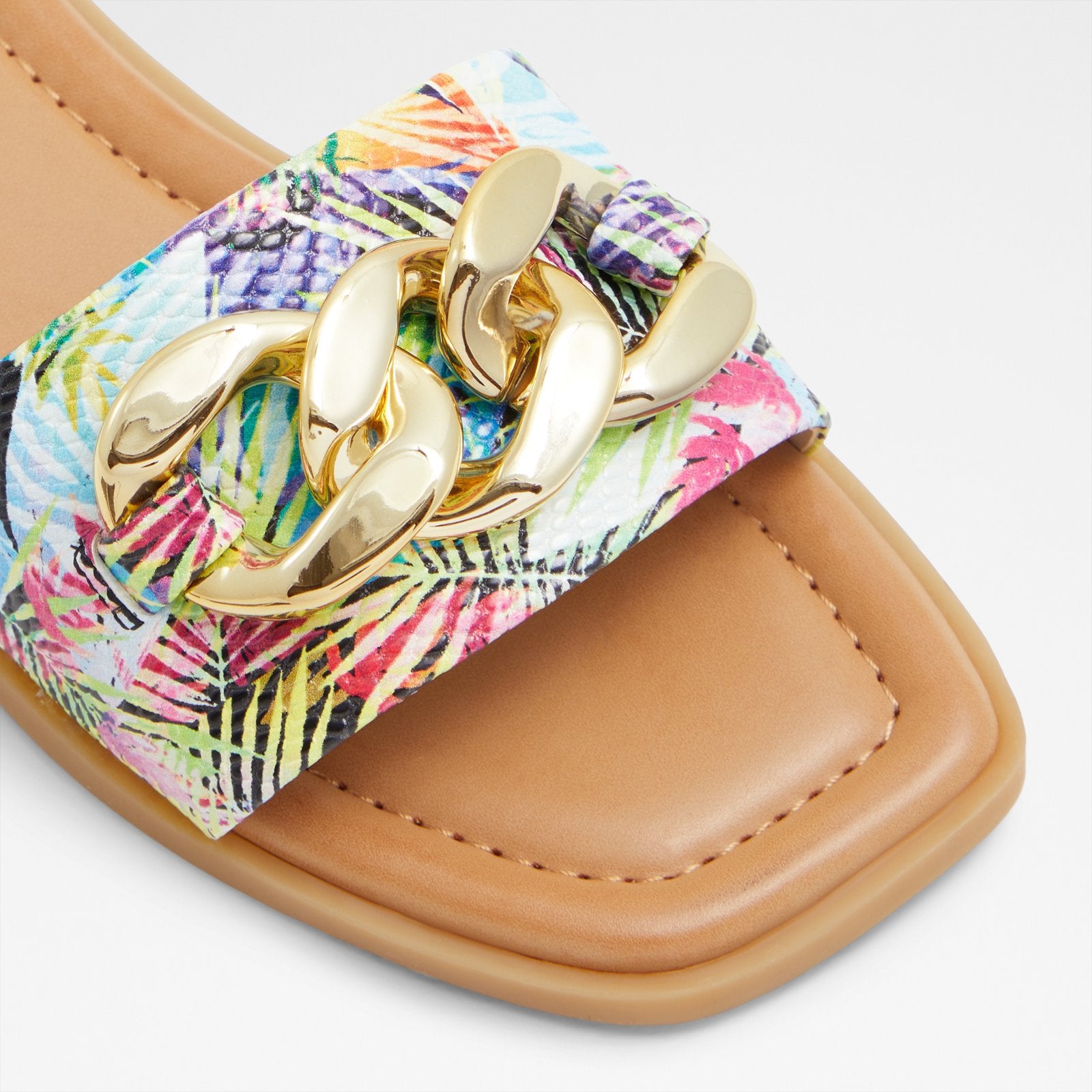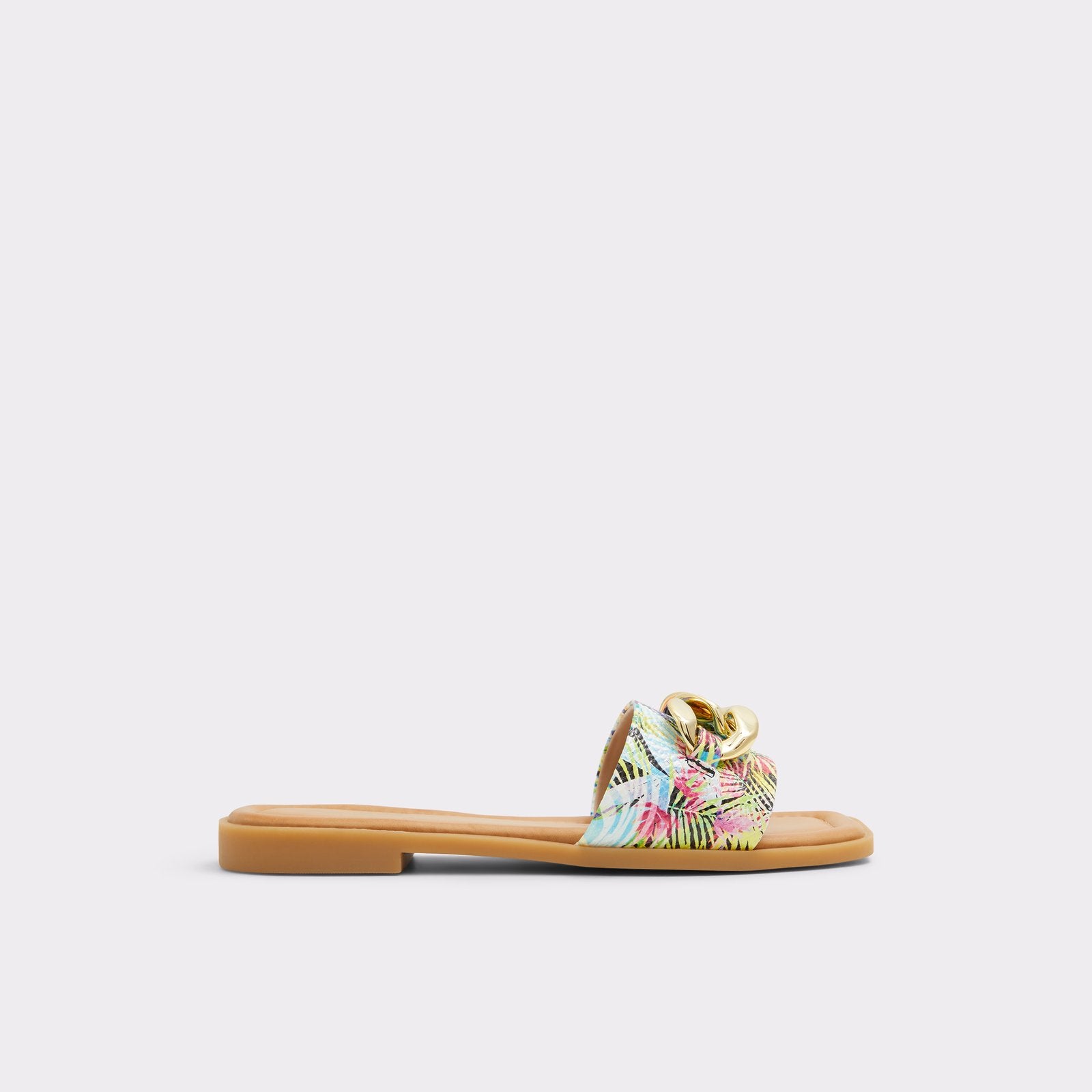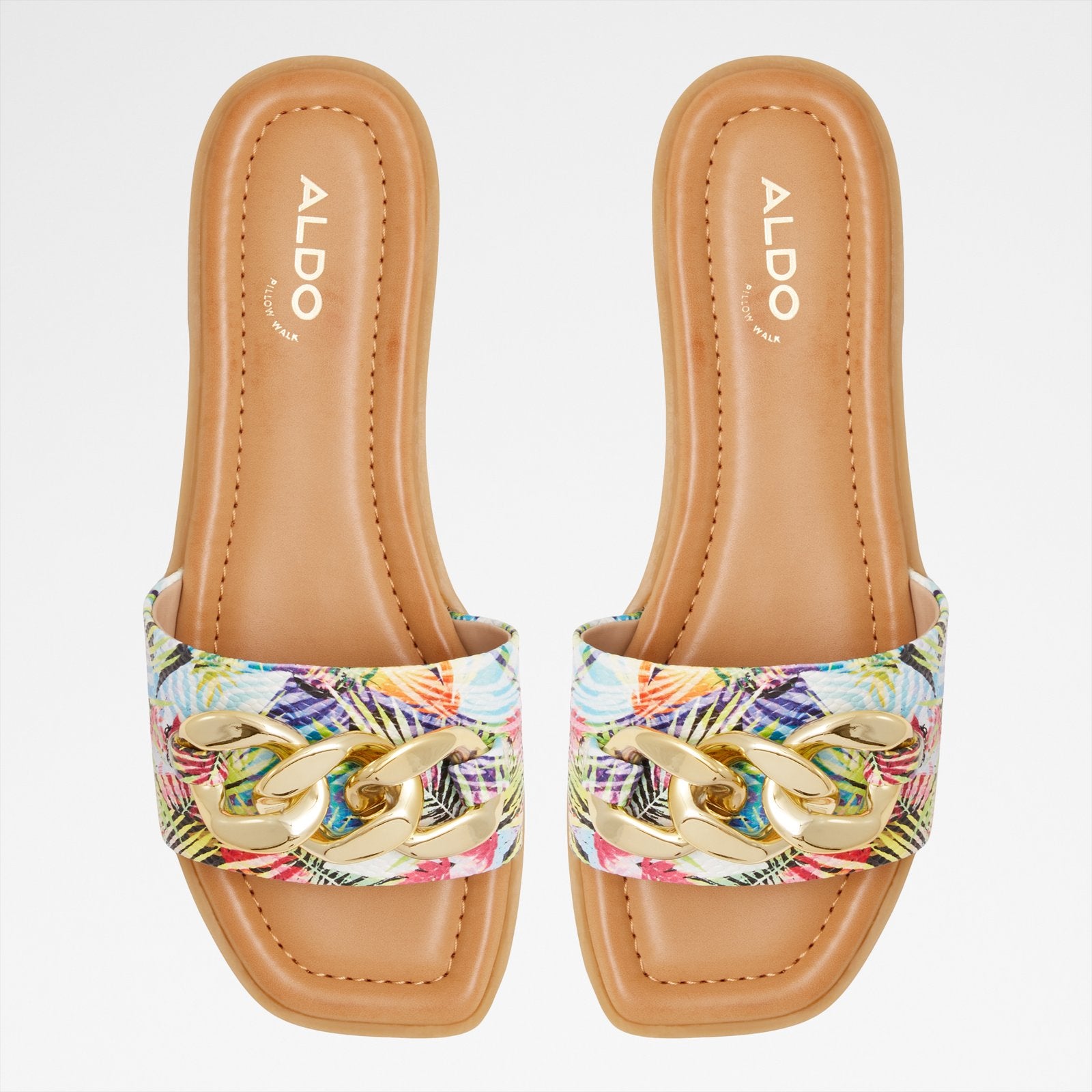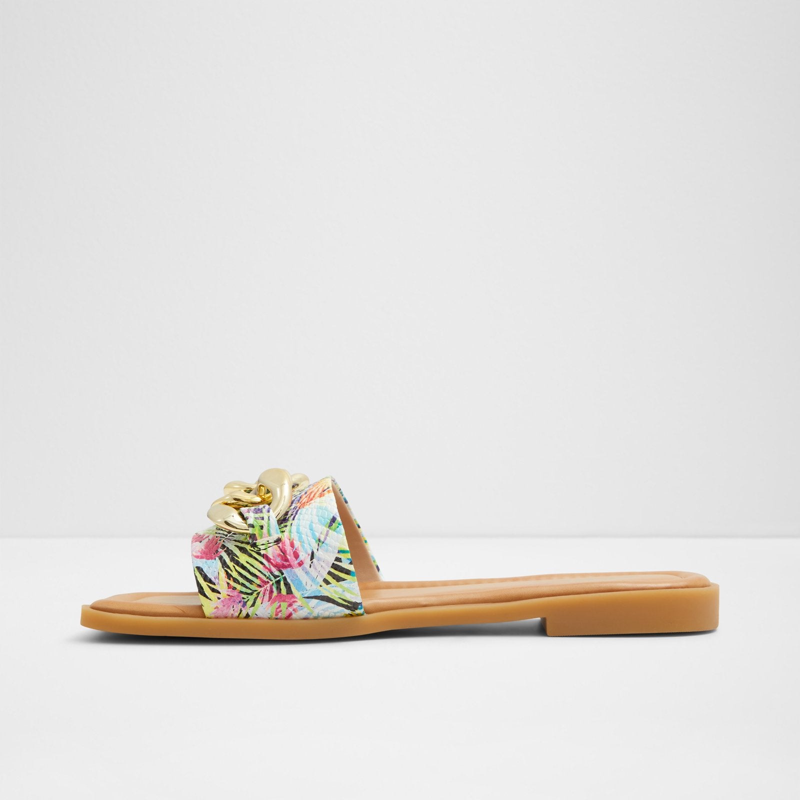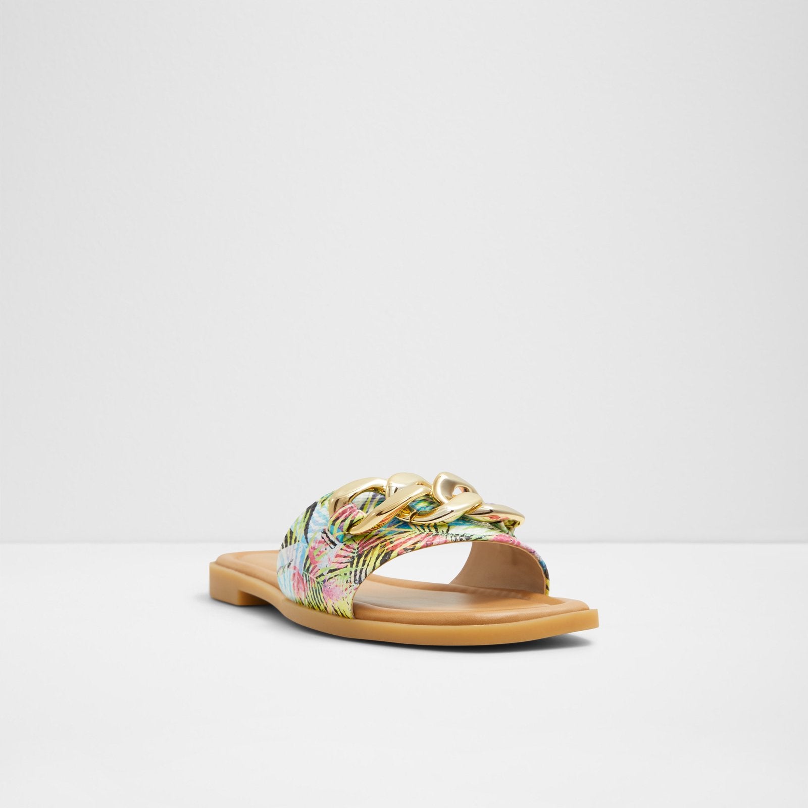 A statement chain gives these wide-strapped flat sandals a fresh feel.