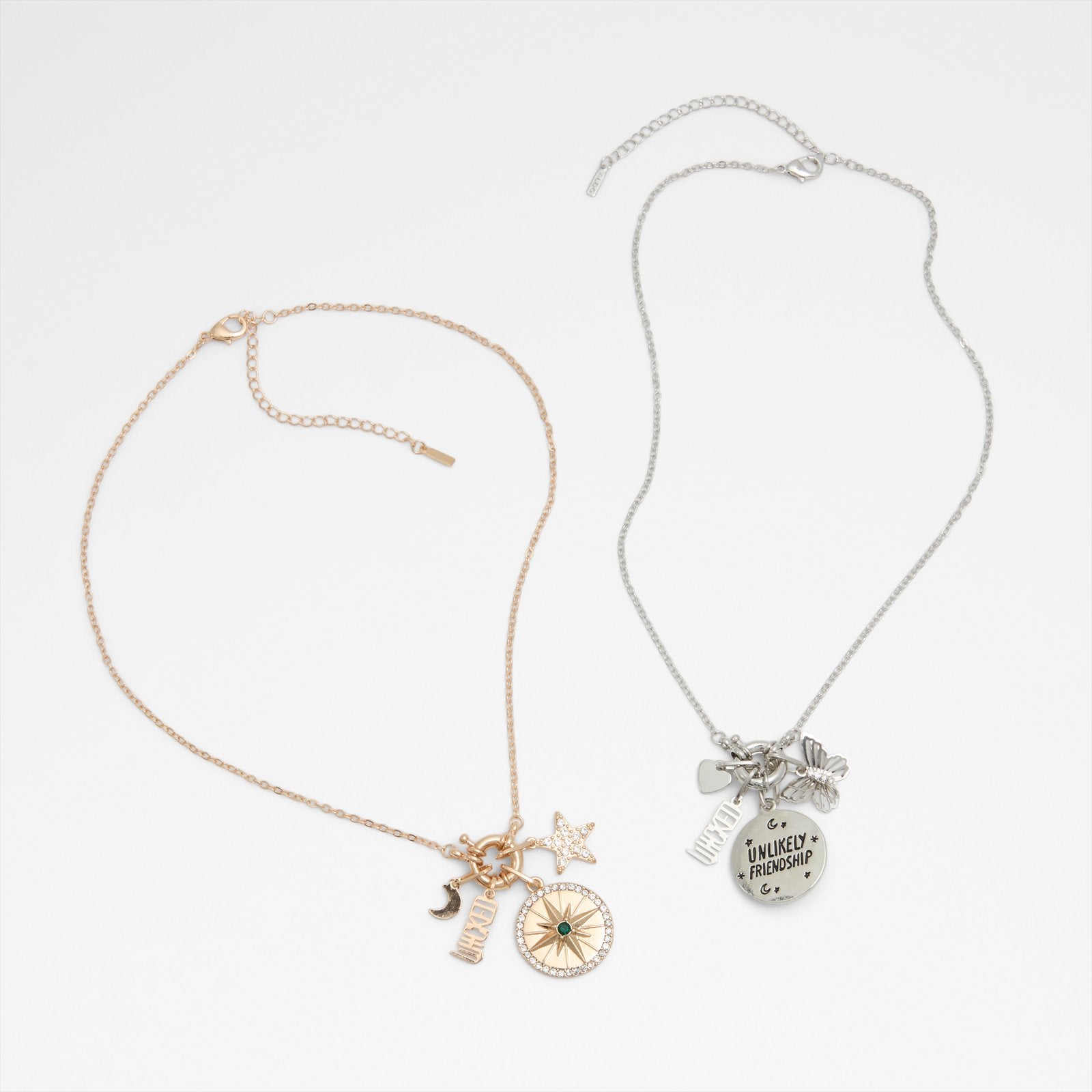 This delightful necklace set features a silver-tone necklace with charms like a heart, "Wicked," and a butterfly, paired with a gold-tone necklace showcasing a star and "Wicked" charm. Perfect for layering or wearing alone, it adds a whimsical touch to any outfit.