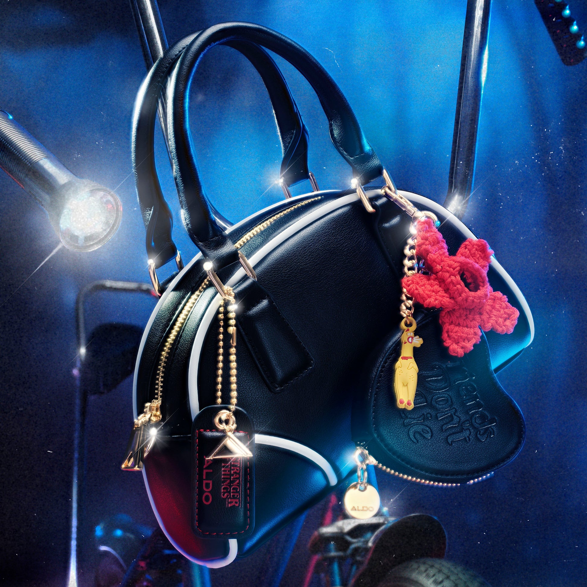 This Stranger Things x ALDO top-handle handbag features the iconic “Friends Don't Lie” quote subtly embossed on its tone-on-tone exterior. Inside, the lining reveals a rad surprise, a graphic collage of all the iconic Hawkins hangouts where all friends are welcome.