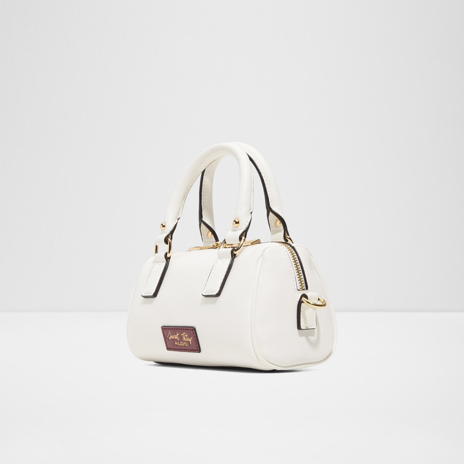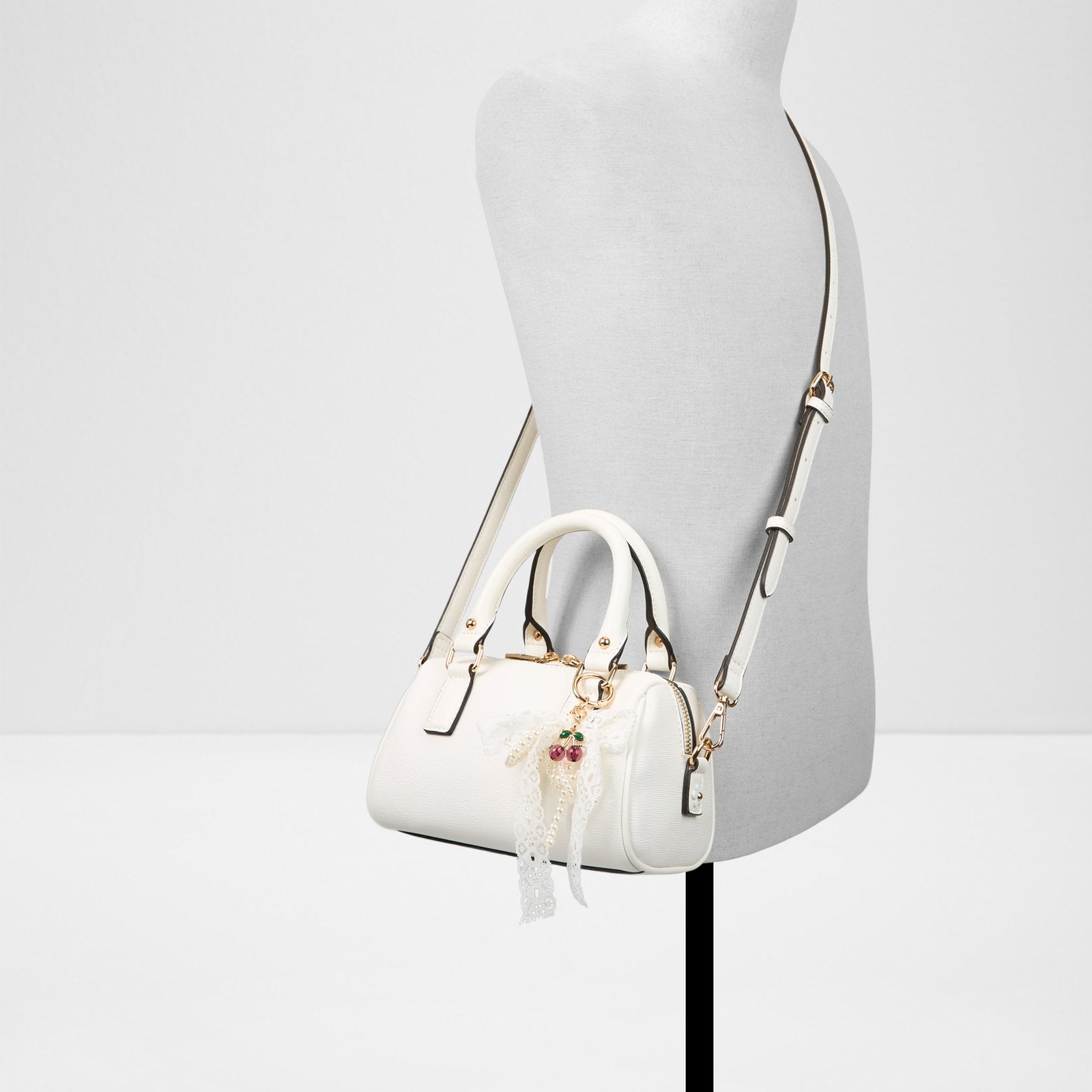 This barrel bag's cute key fob and chic metal accents add a playful edge to its sleek, rounded silhouette.