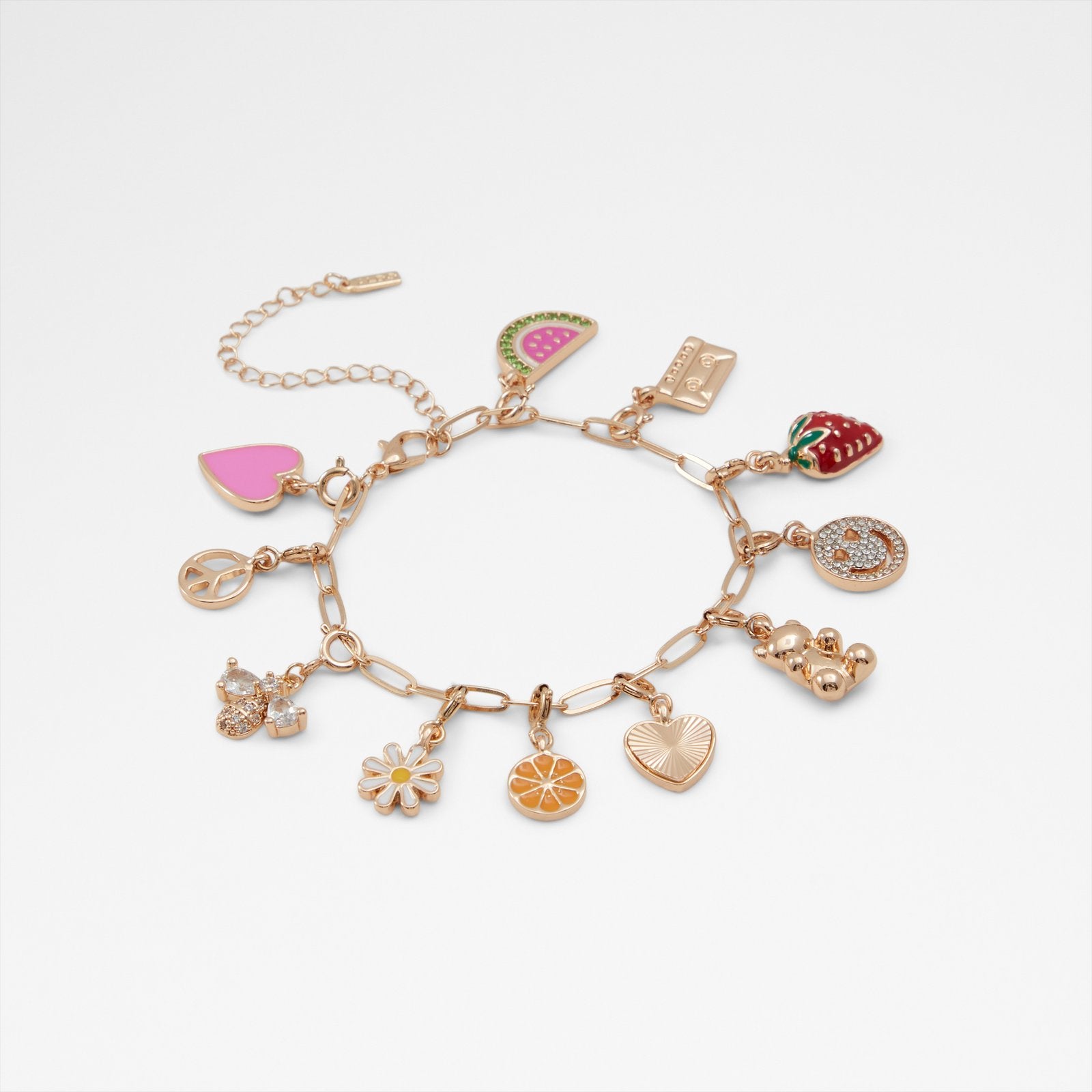 This charm bracelet features playful symbols like a smiley face, strawberry, watermelon, heart, peace sign, and more, offering a colourful and lively addition to any outfit.