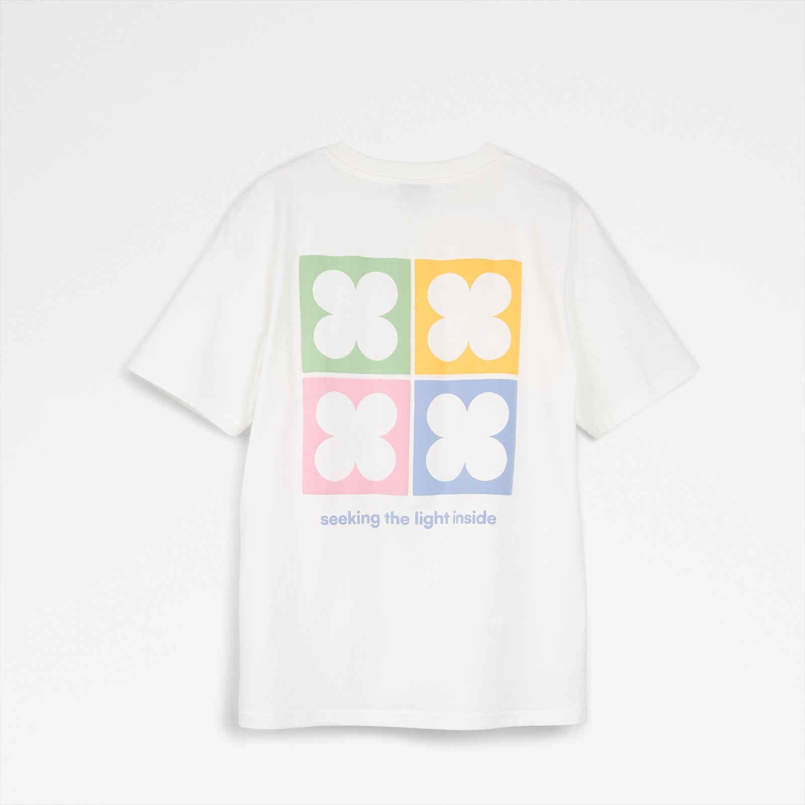 Hyperthalamuscorp’s signature 3D style goes 2D in this printed unisex white tee. With graphic smiley face and flower symbols adorning the front, flip to the back for a bold color-blocked design in pastel shades.
