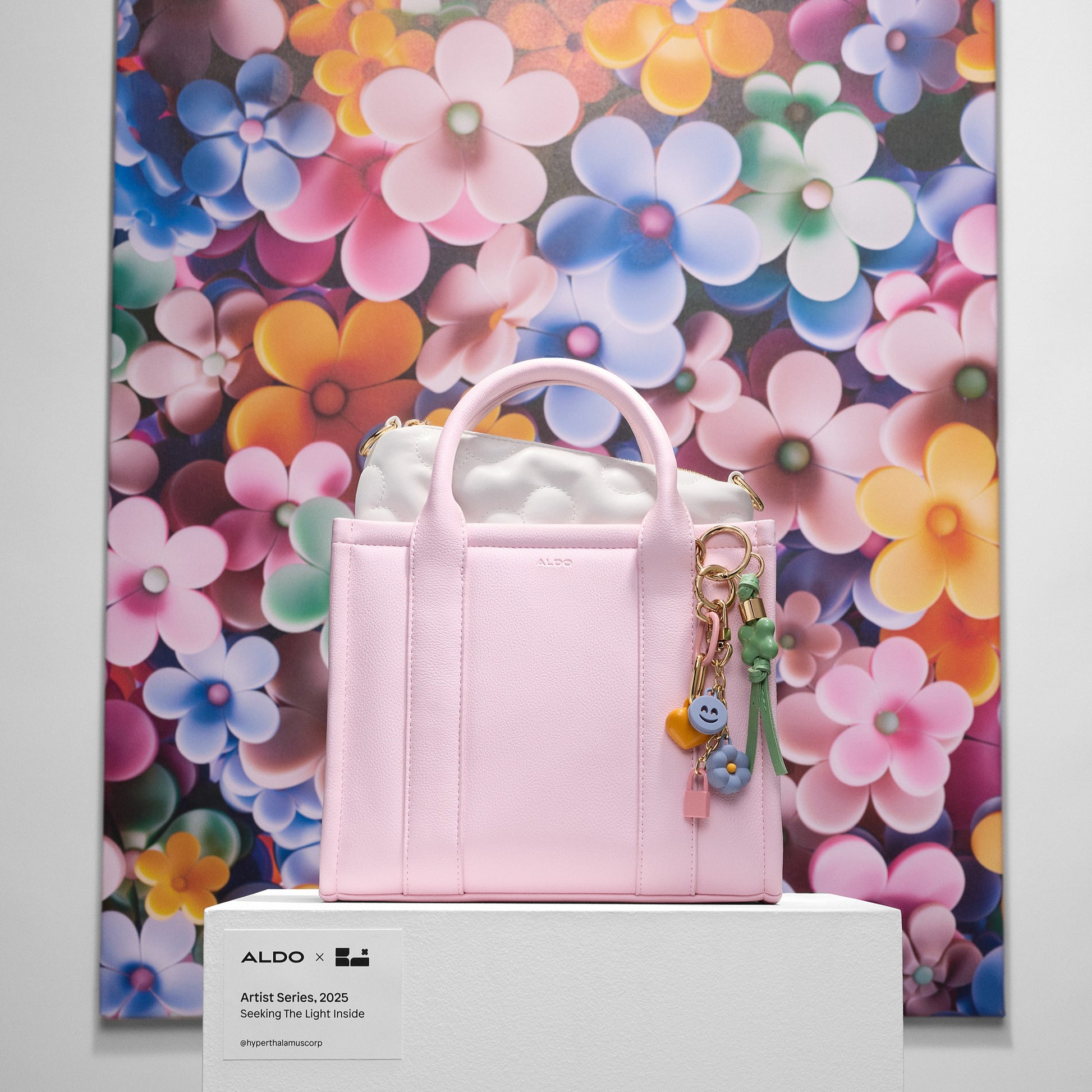 This structured handbag sits pretty in pink with mix and match accessories designed by visual artist Hyperthalamuscorp. Held by the top handle or detachable crossbody strap, this classic style gets a creative pop with a colorful 3D bag charm and patterned interior pouch.