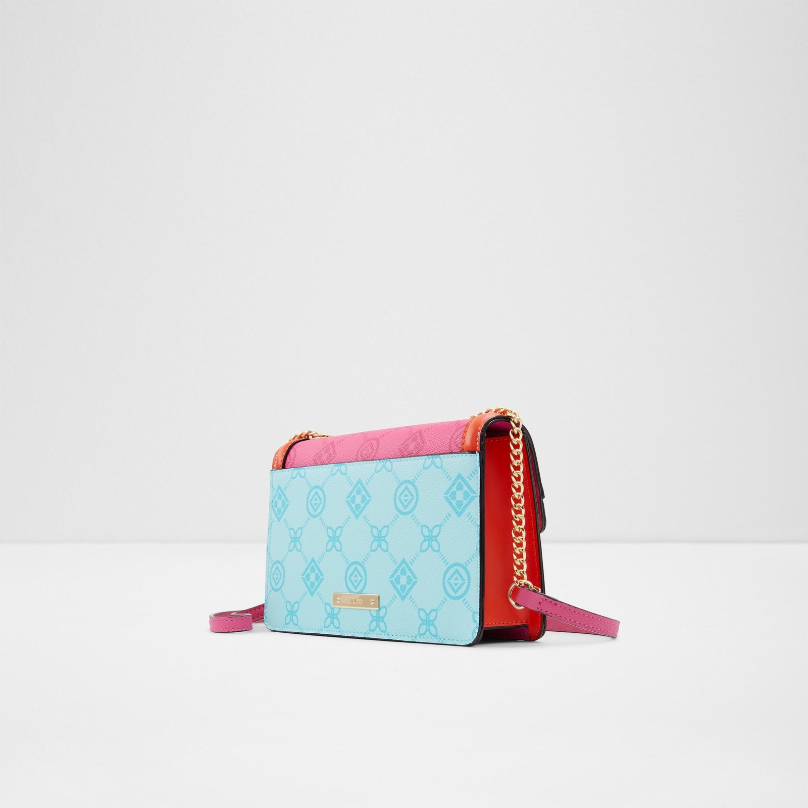 Ladies medium colorblock crossbody with non-removable hanging pouch detailing.