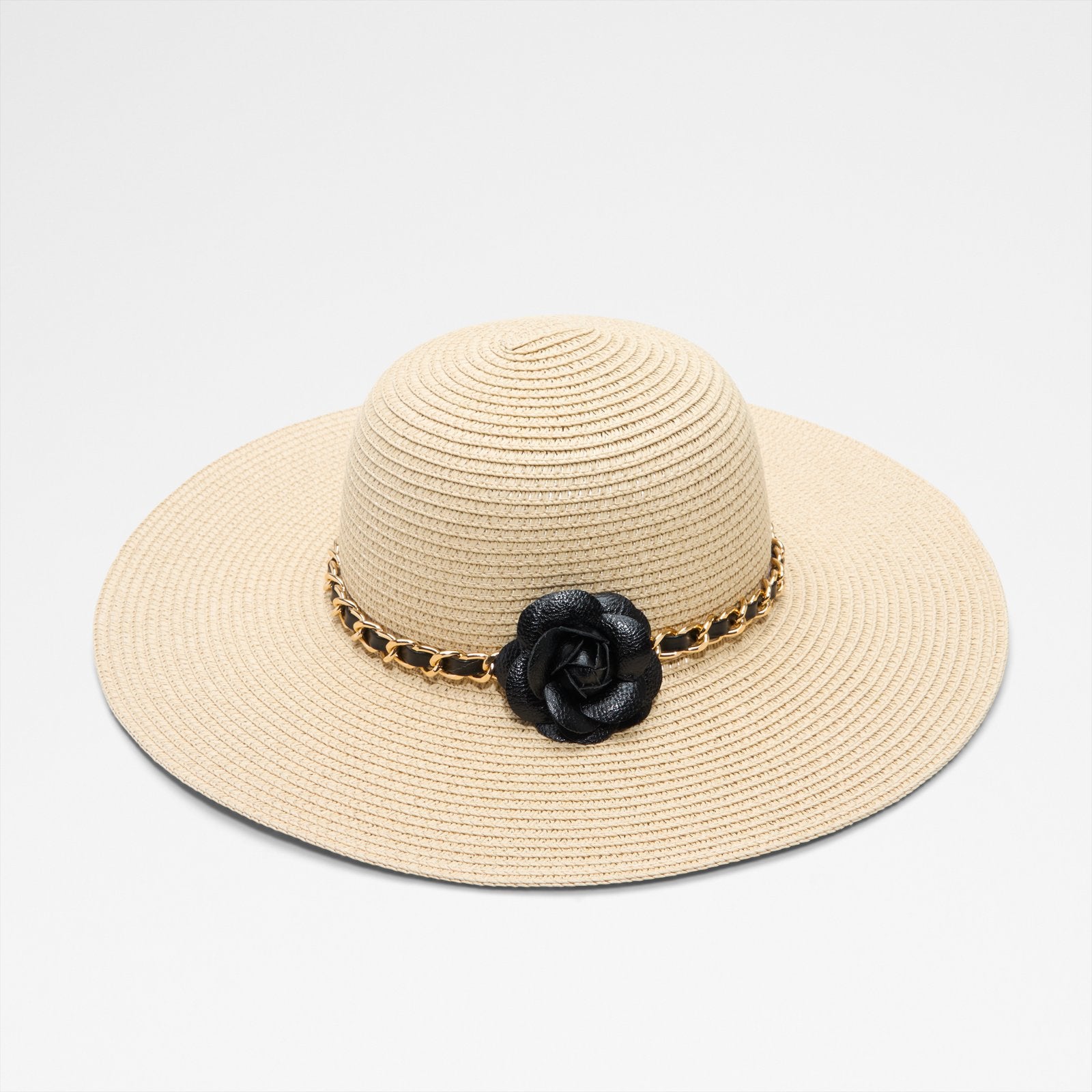 Elegant beige straw hat with a black ribbon, adorned with a delicate gold chain and floral embellishment. A chic accessory for sophisticated sunny-day styling.