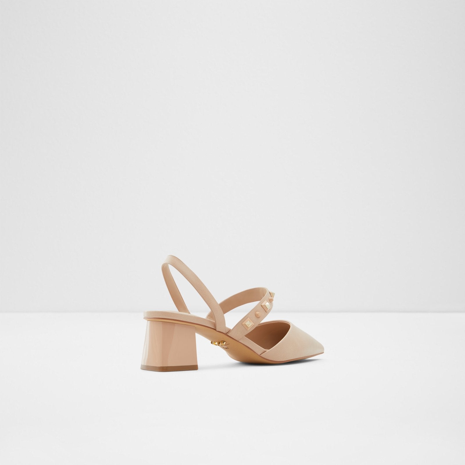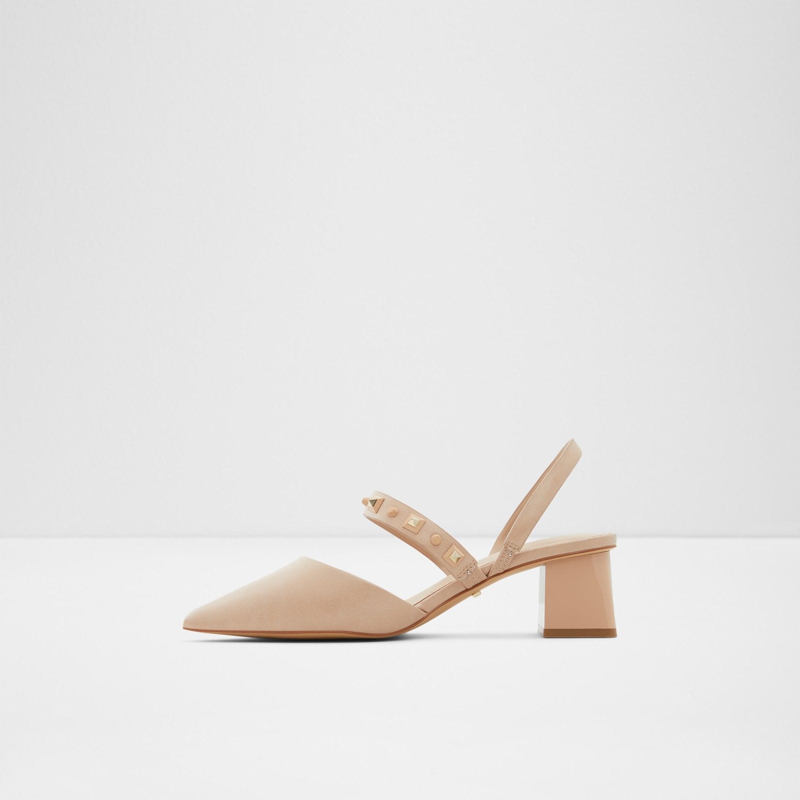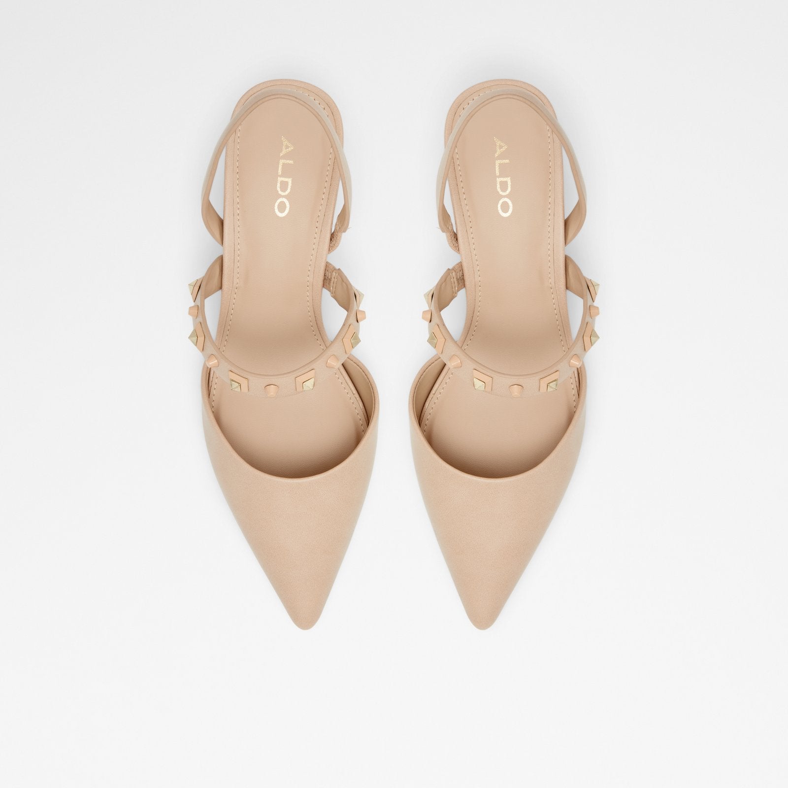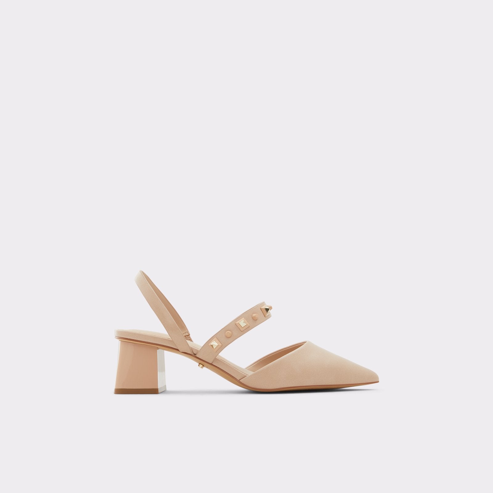 Minimalist, but still big on style. Studded details add extra oomph to these pointy toe sling backs. Plus, the block heel is the perfect height to sport all season long.