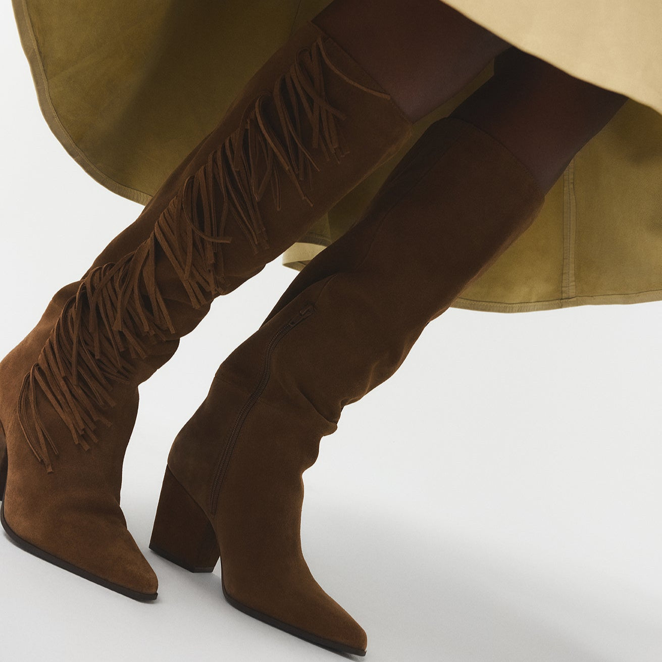 Softened by a subtle fringe, these classic cowboy boots combine clean lines with a modern twist.