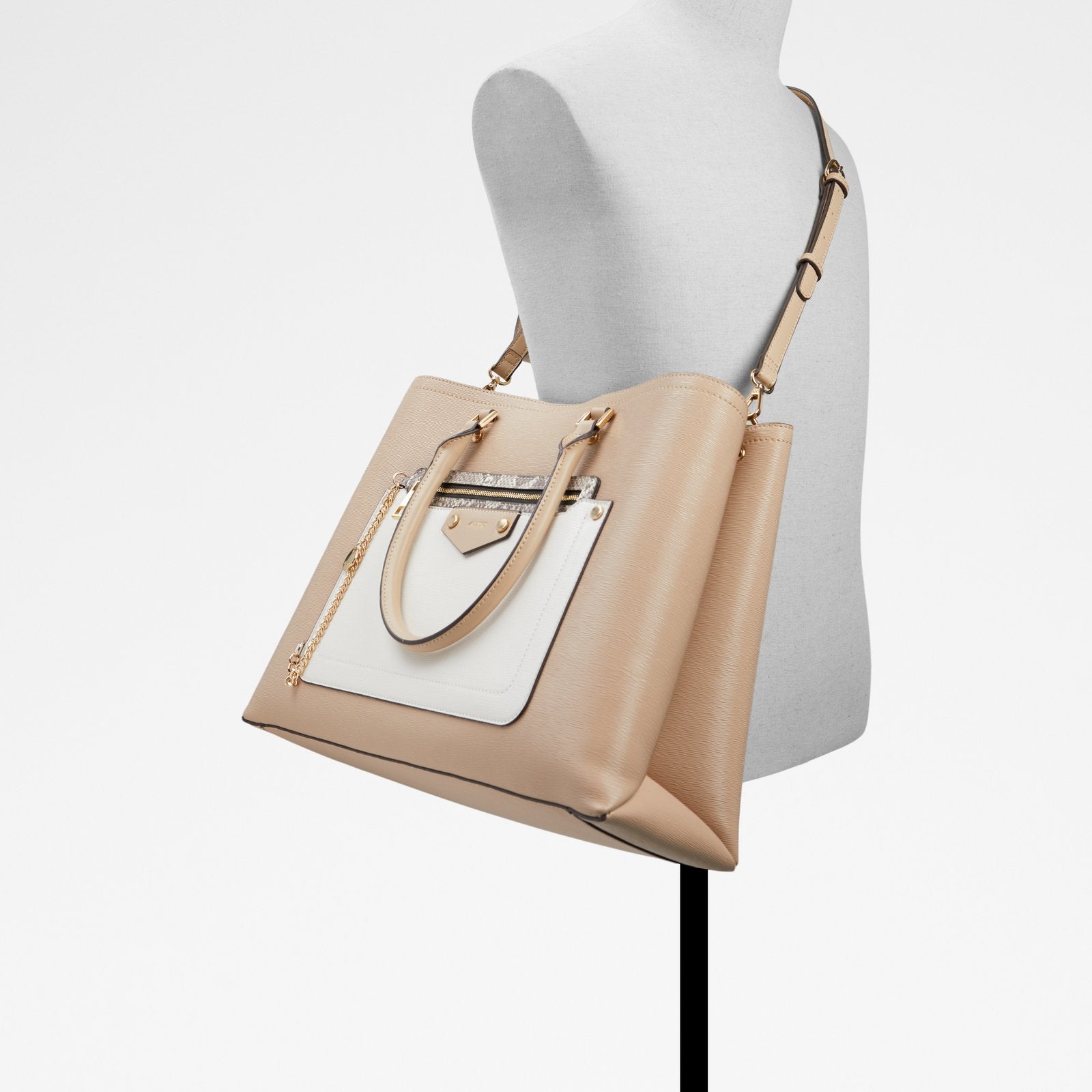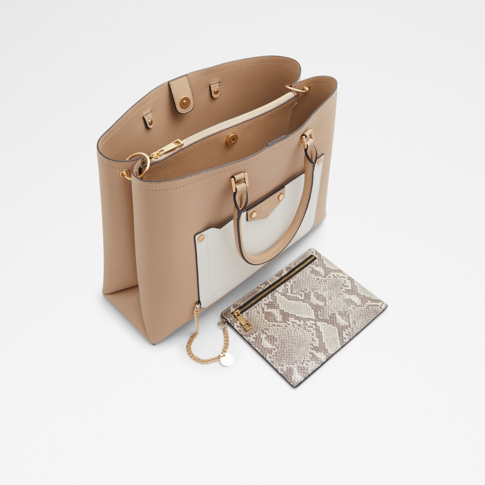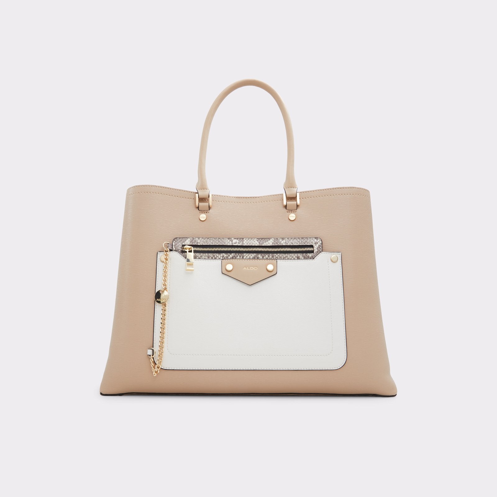 This neutral tote with removable puch is the ideal accessory to pair with any look.