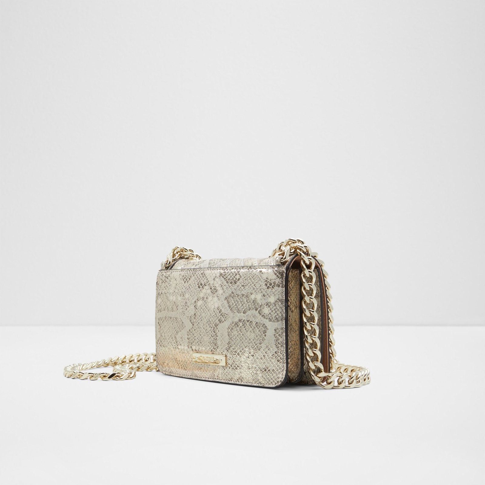 Ladies mini structured quilted crossbody with non-removable crossbody strap, chain detailing and ALDO back metal plate branding.