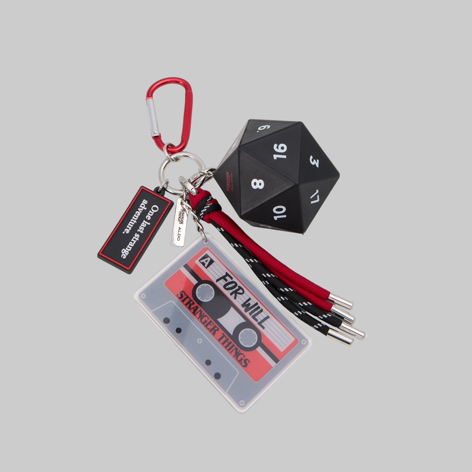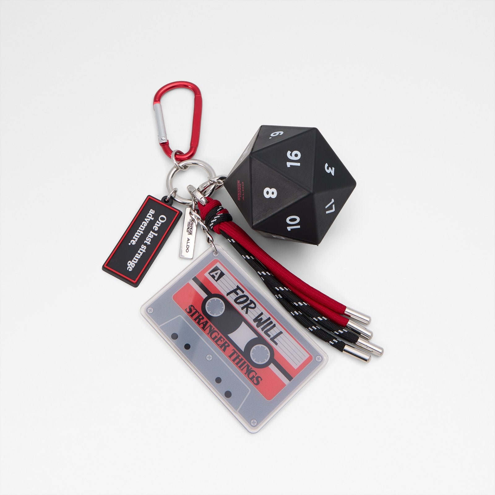 This retro-inspired black, red, and white Stranger Things x ALDO keychain features a mixtape and the iconic D&D dice. Unlock a new level of totally tubular fandom.