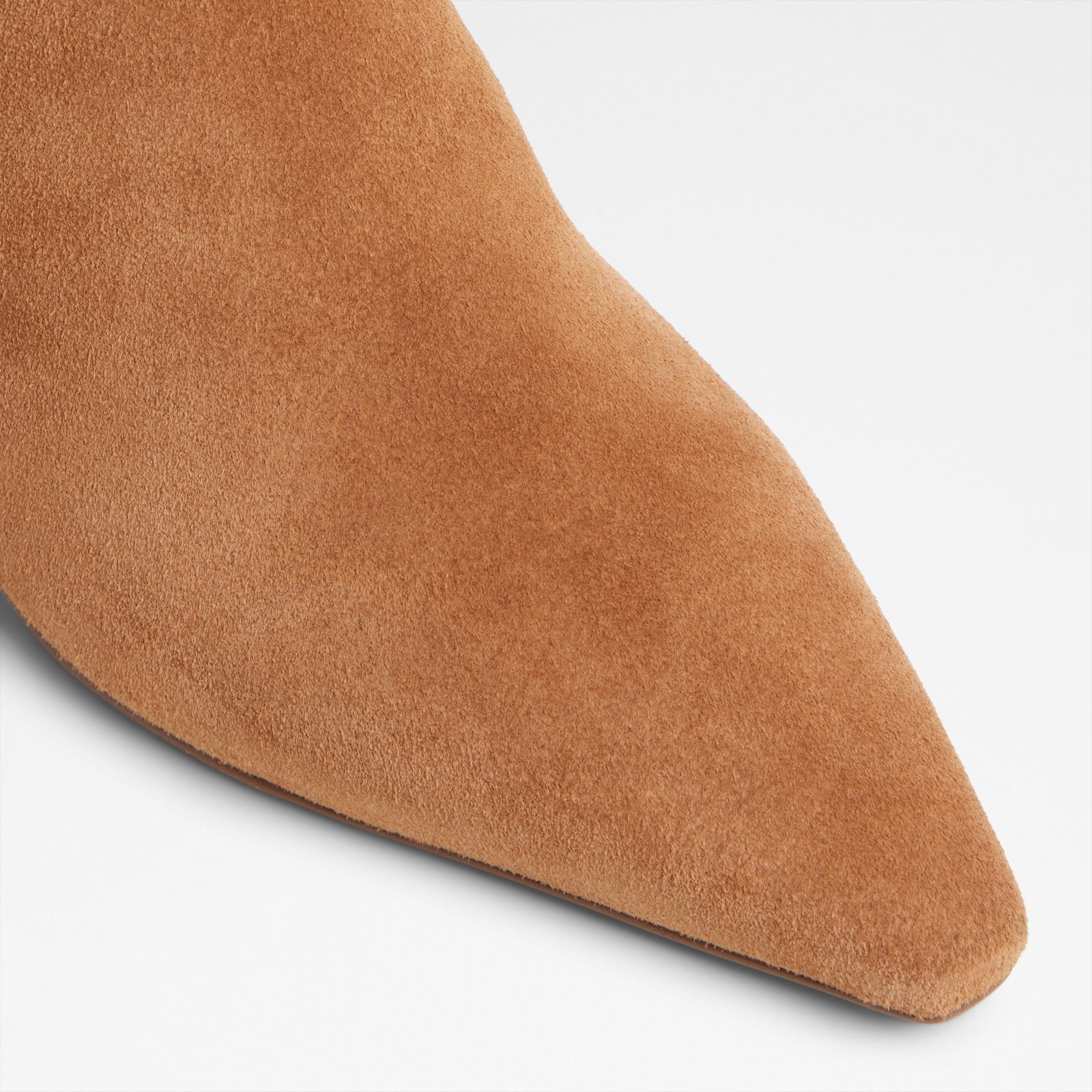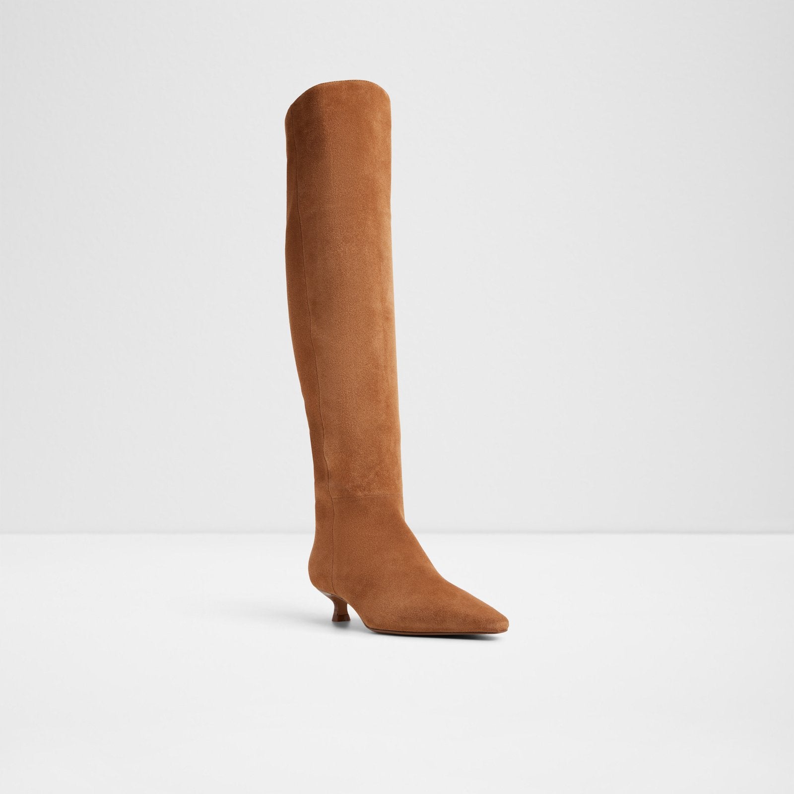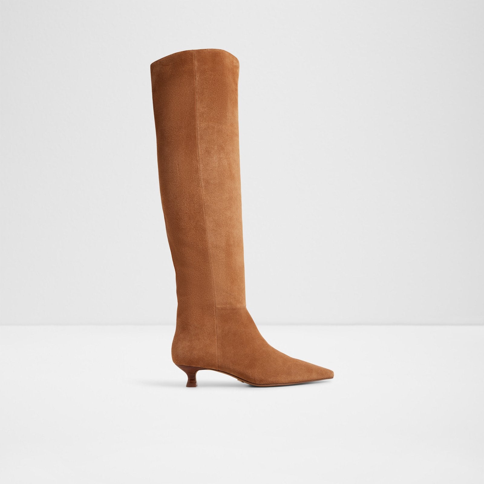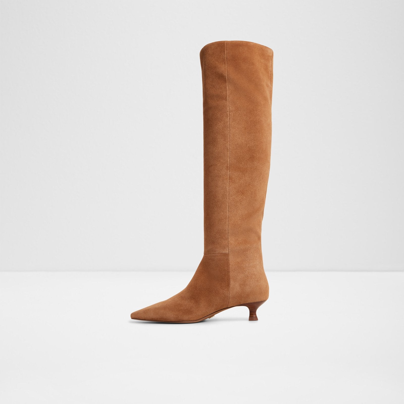 All about the silhouette. This leather knee-high is minimalist but major, thanks to a low-to-the-ground kitten heel and chic pointed toe.