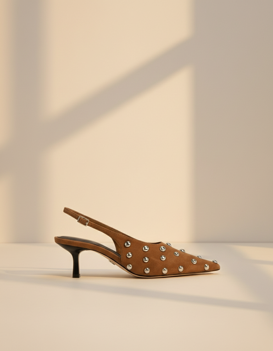 A sleek silhouette with a rebellious twist. These studded slingback heels don't play it safe.