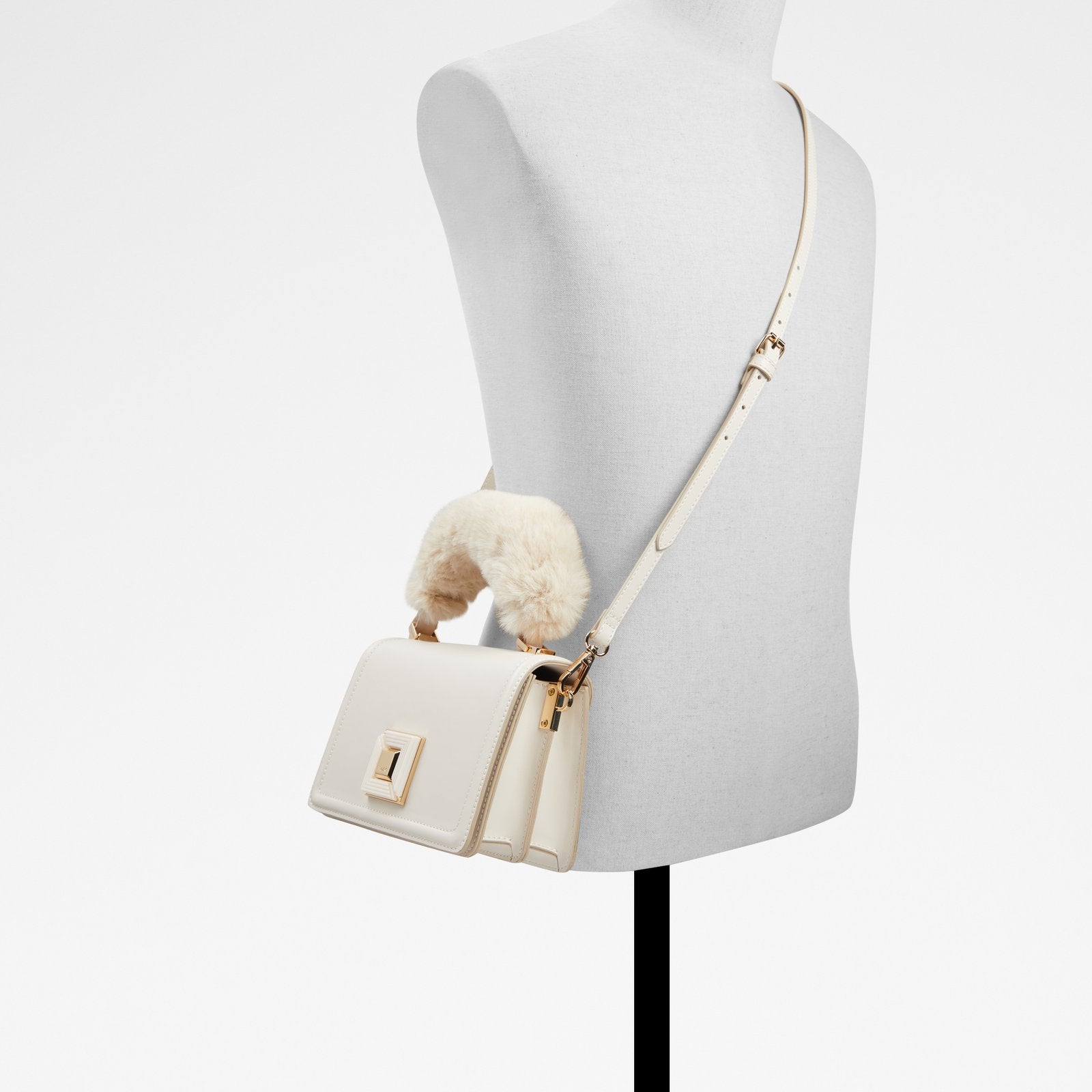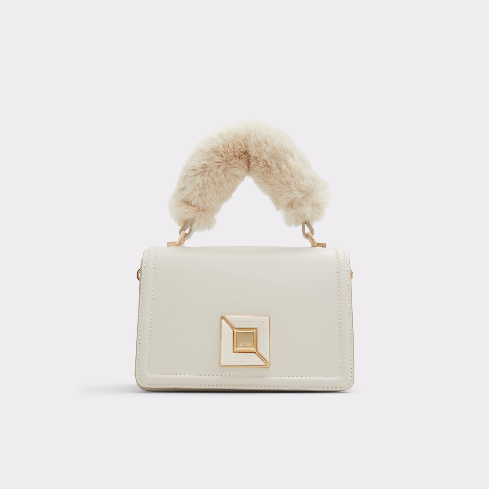 Add a little fun to your wardrobe with this neutral cross body bag featuring a faux fur top handle.