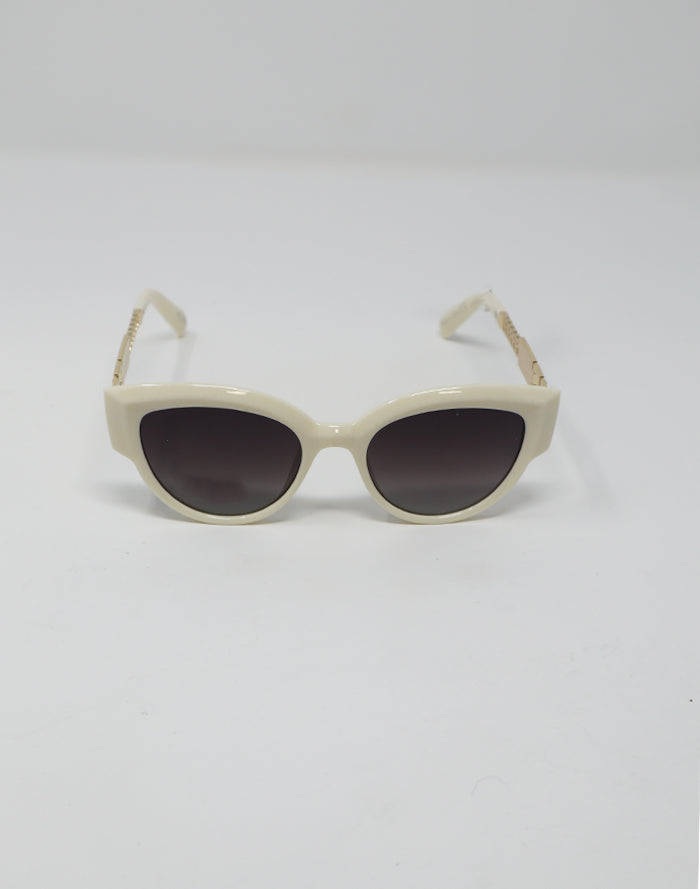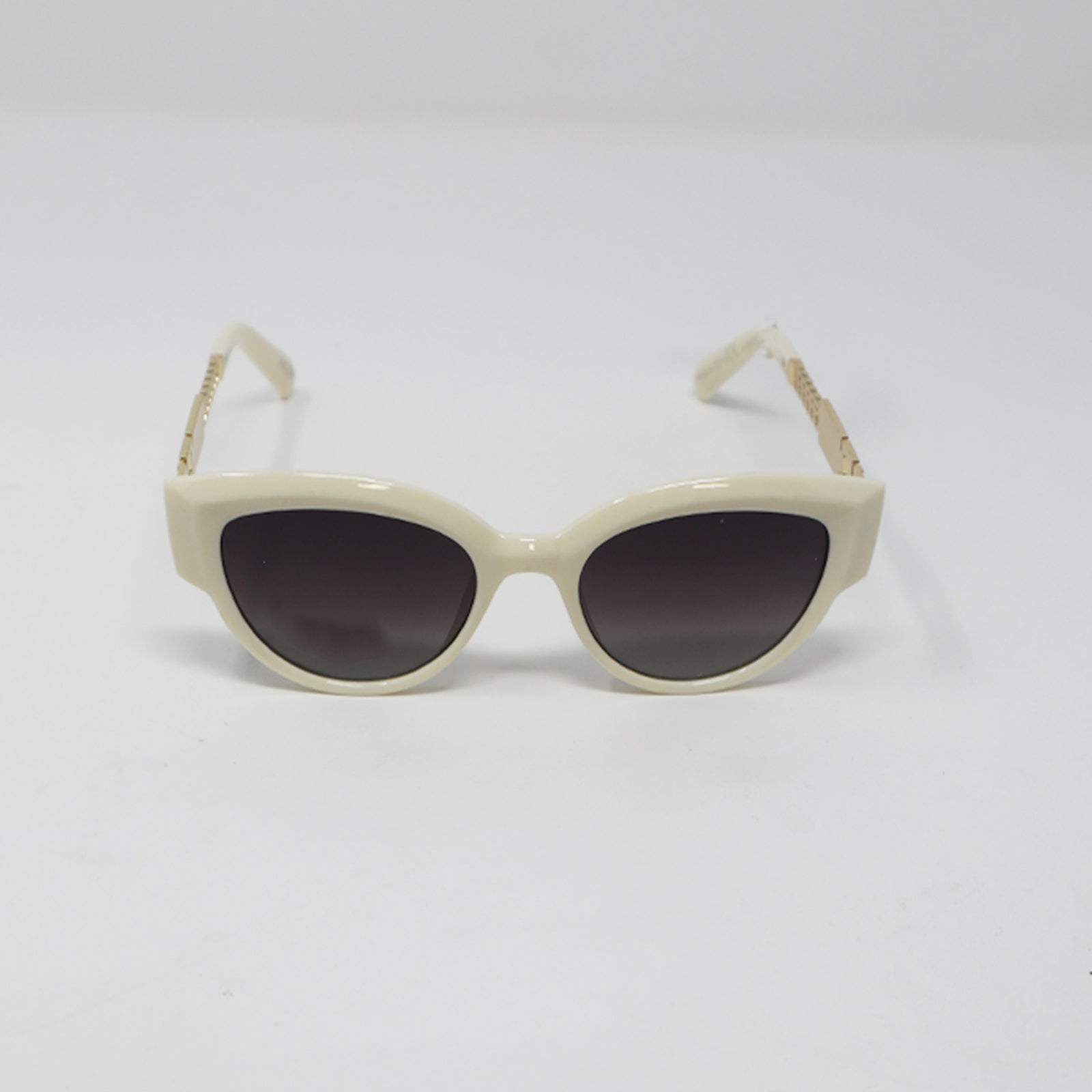 Dress up a casual wardrobe with this elegant pair of cat-eye women’s sunglasses. Ivory-tone frames feature smoke-tinted gradient lenses for just the right amount of contrast. Gold-tone metal arms include white tips and detailing for a flawless, pulled-together look.