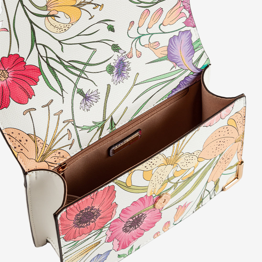Ladies crossbody with non-removable chain with hanging charms and metal corners detailing.