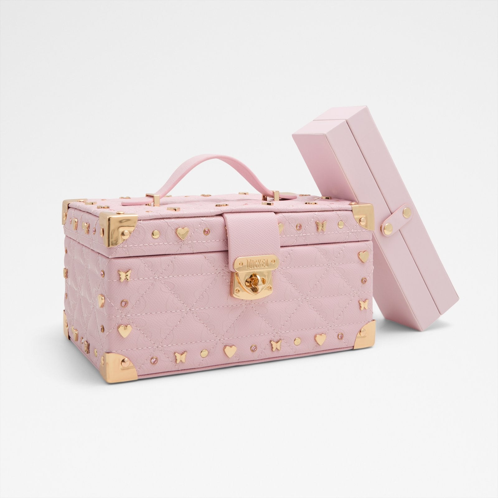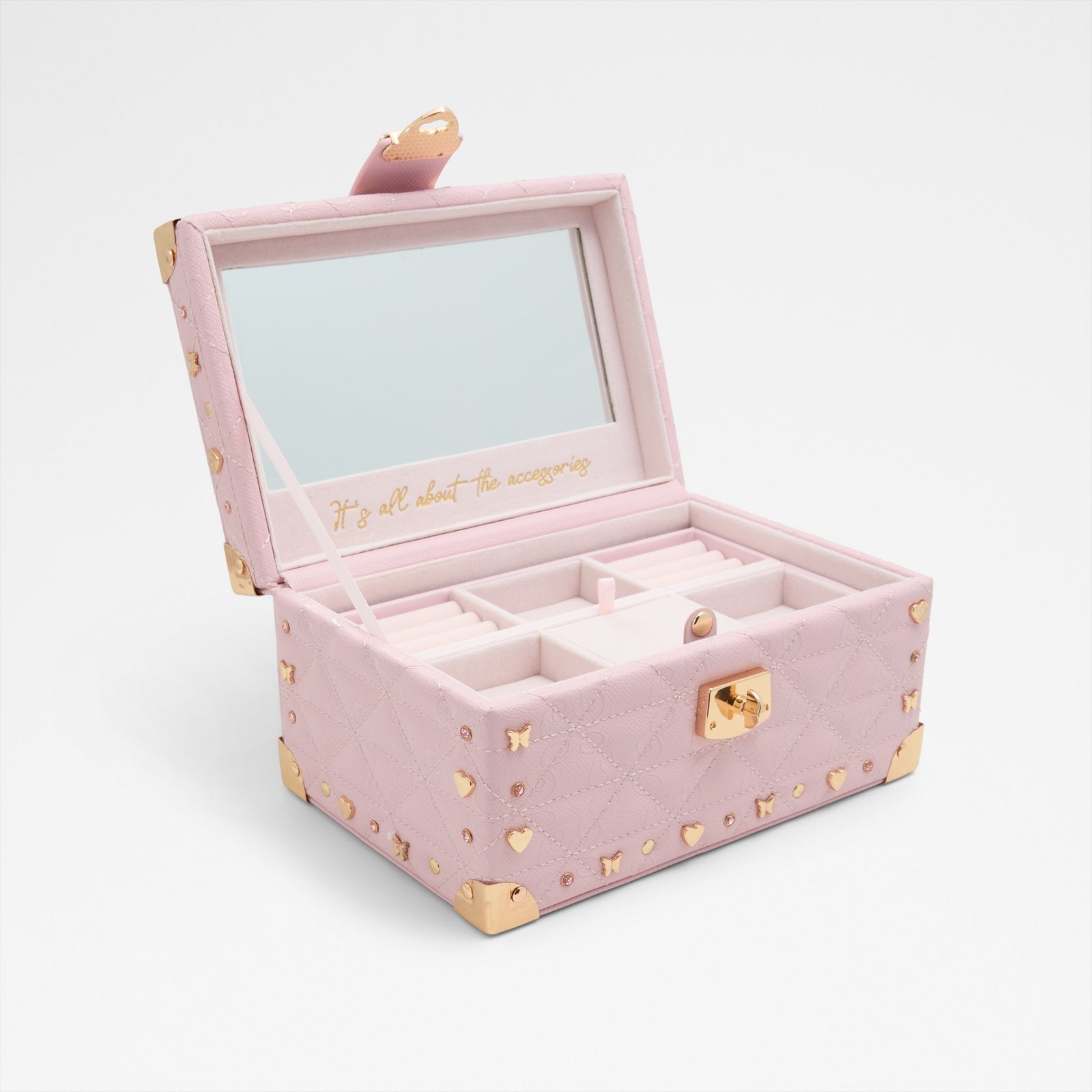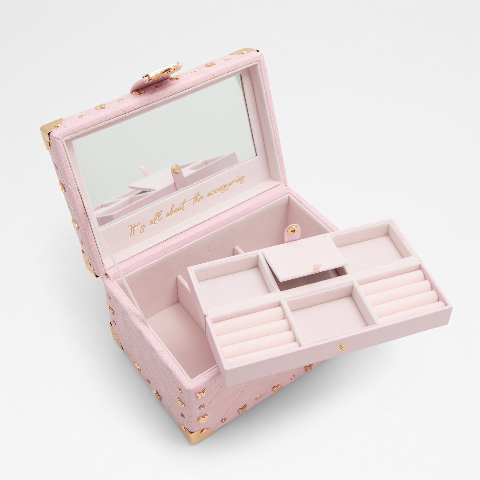 This charming pink jewellery box is perfect for organising your accessories with style. It features multiple compartments, a built-in mirror, and elegant gold details. The top handle adds a chic touch, making it easy to carry.
