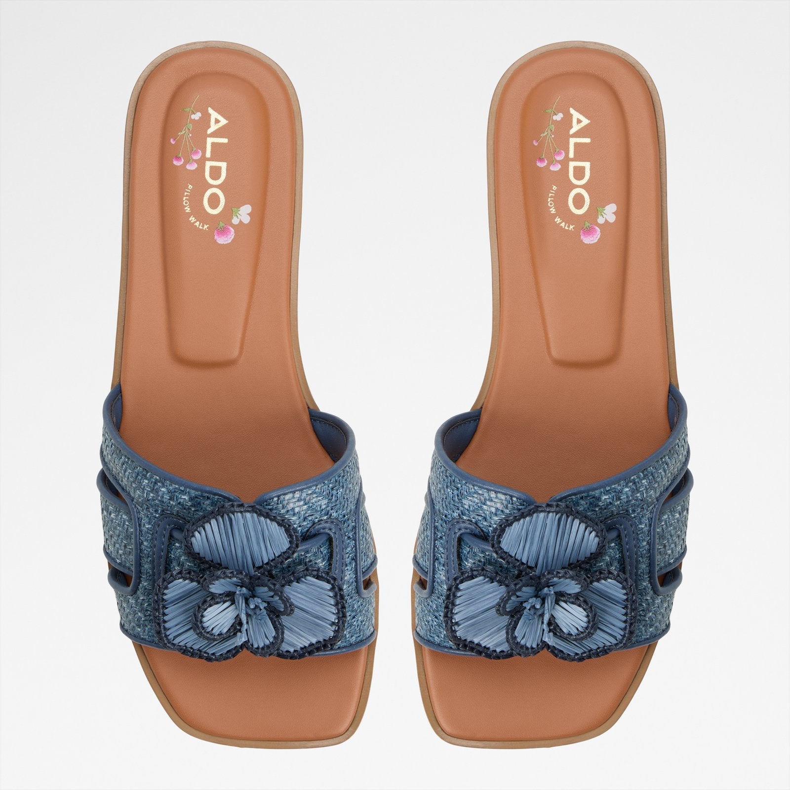 Add a floral touch to your look with these denim flat sandals, featuring cute flower details for a fun, trendy vibe.