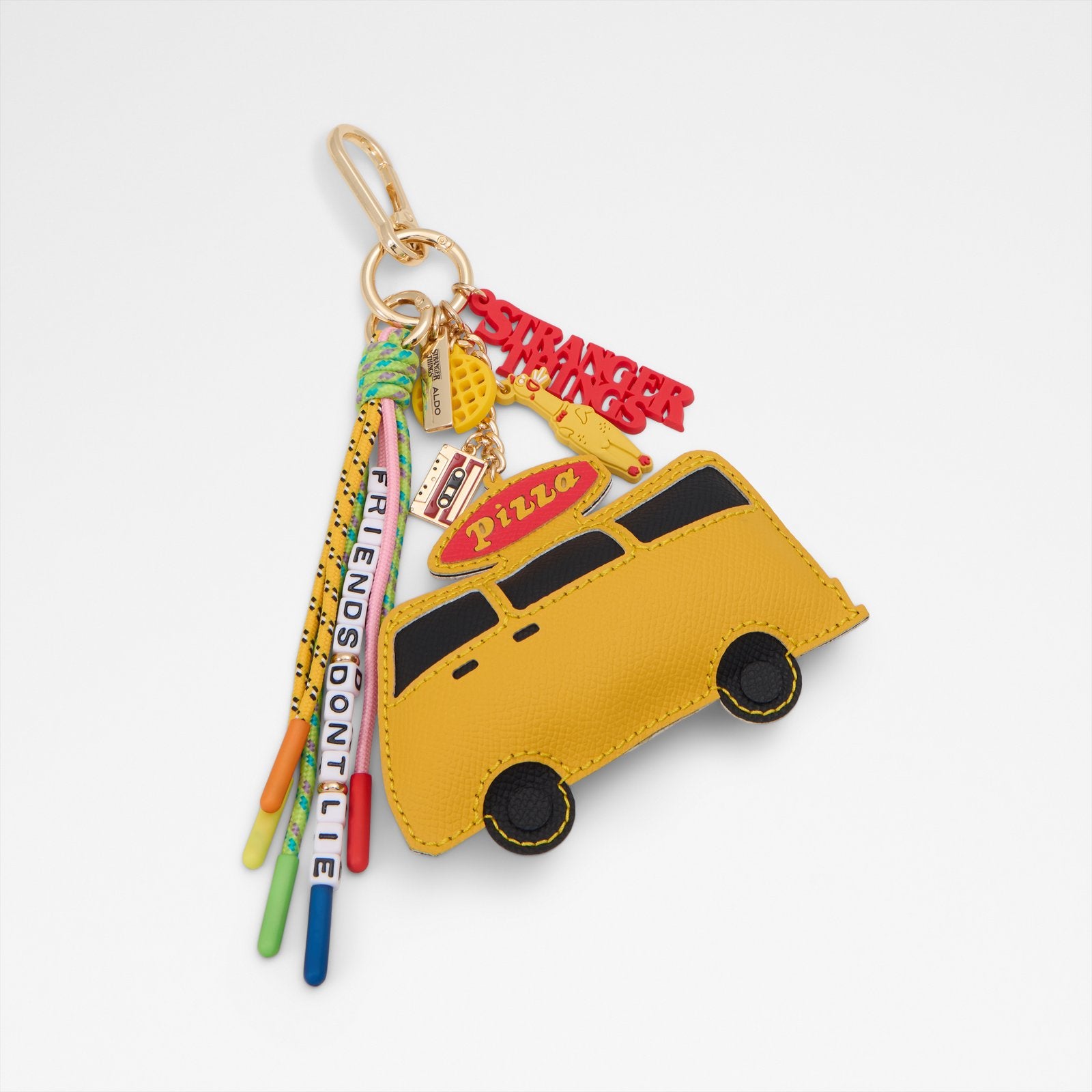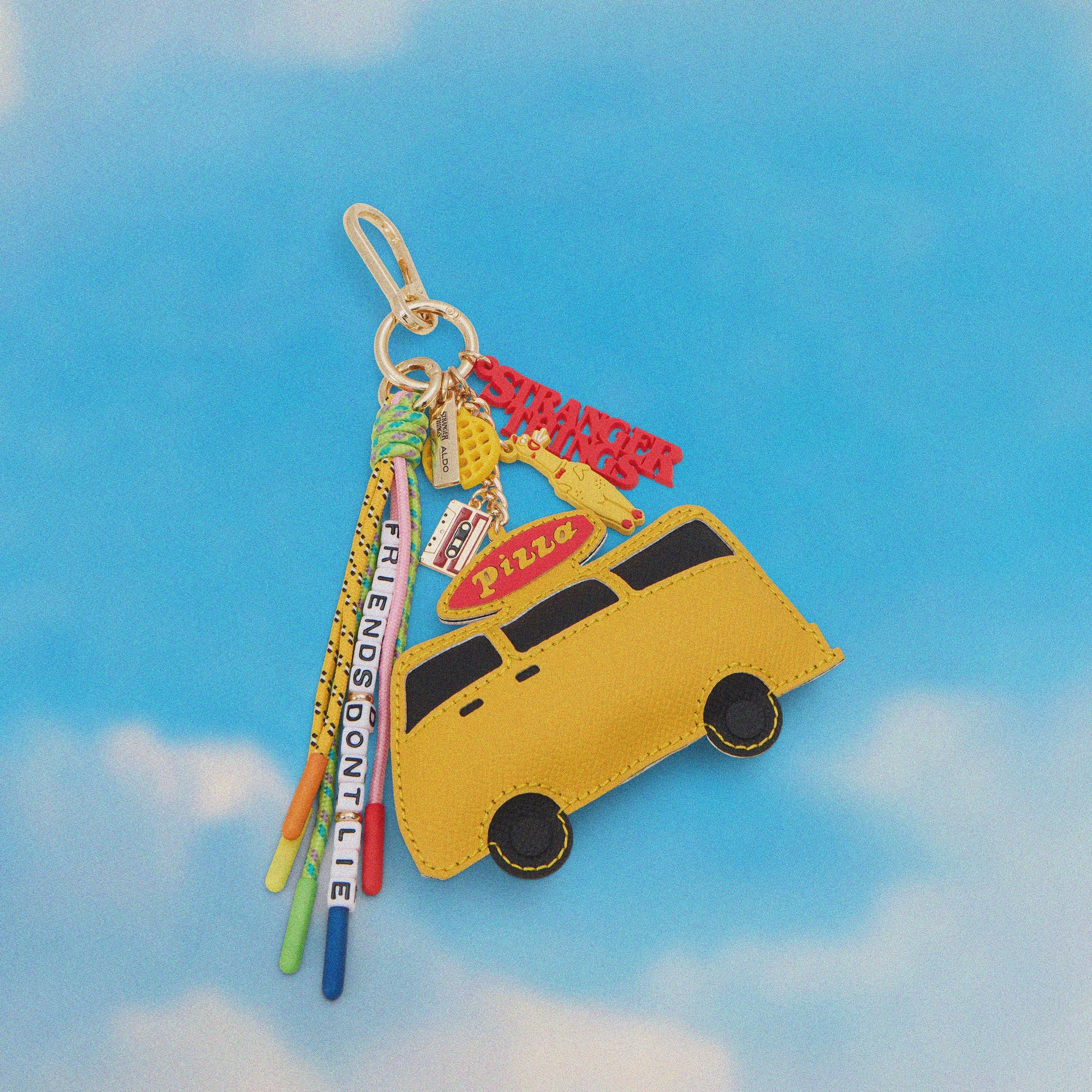 This Stranger Things x ALDO keychain features the totally tubular Surfer Boy Pizza van and delivers the most iconic hanging charms: a mixtape, waffle, rubber chicken, playful bungee cords, and the iconic “Friends Don't Lie” quote.