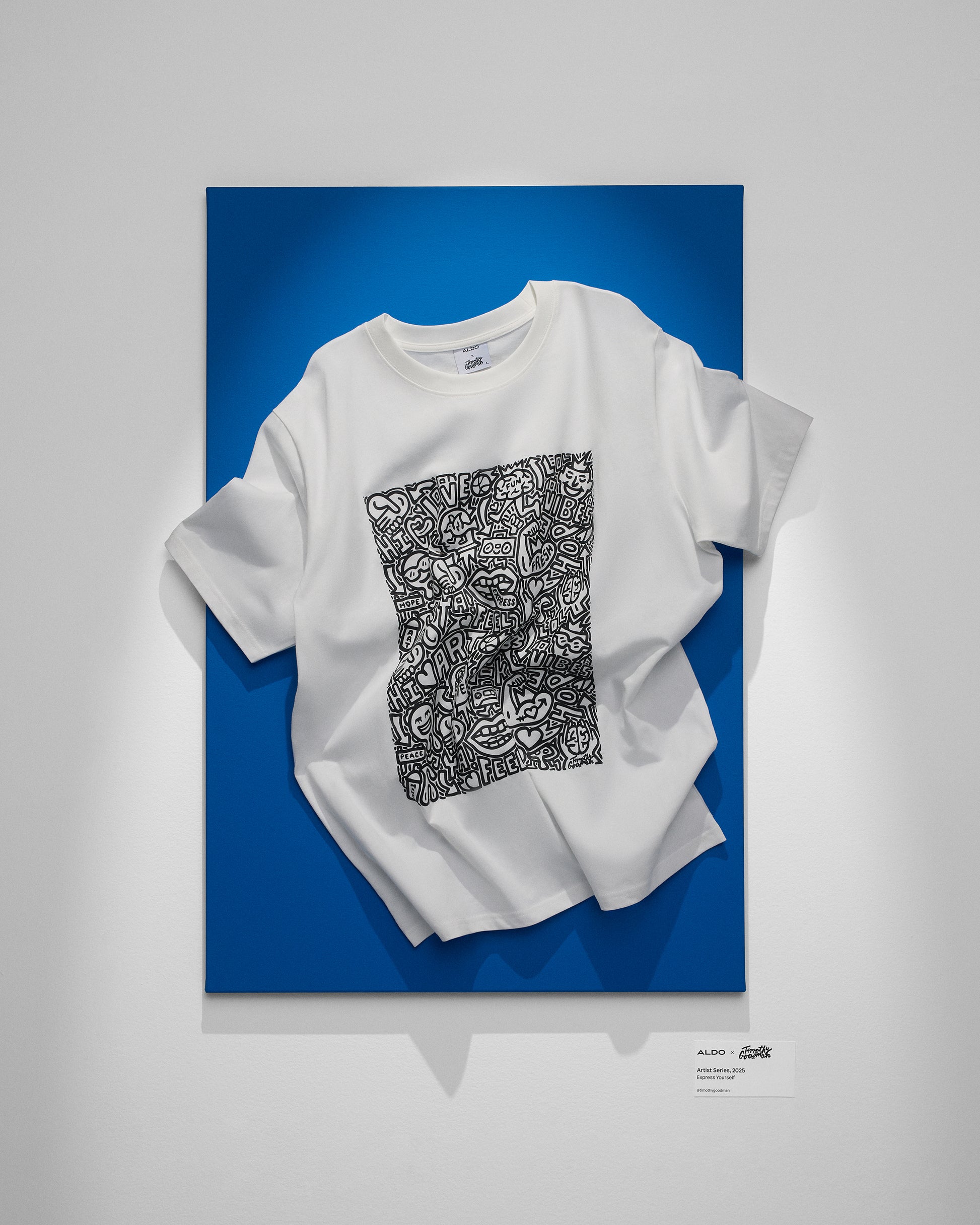 Timothy Goodman infuses his award-winning artistry into this classic white tee, with a bold black and white design in his signature style making a creative statement in a unisex fit.