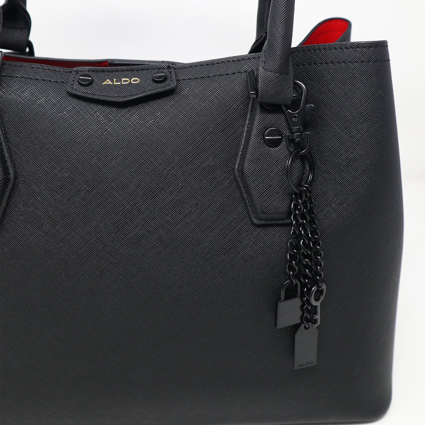 Ladies unlined large tote with non-removable keyfob and pin stud detailing, bold red interior and classic black exterior make this the perfect back to school bag.