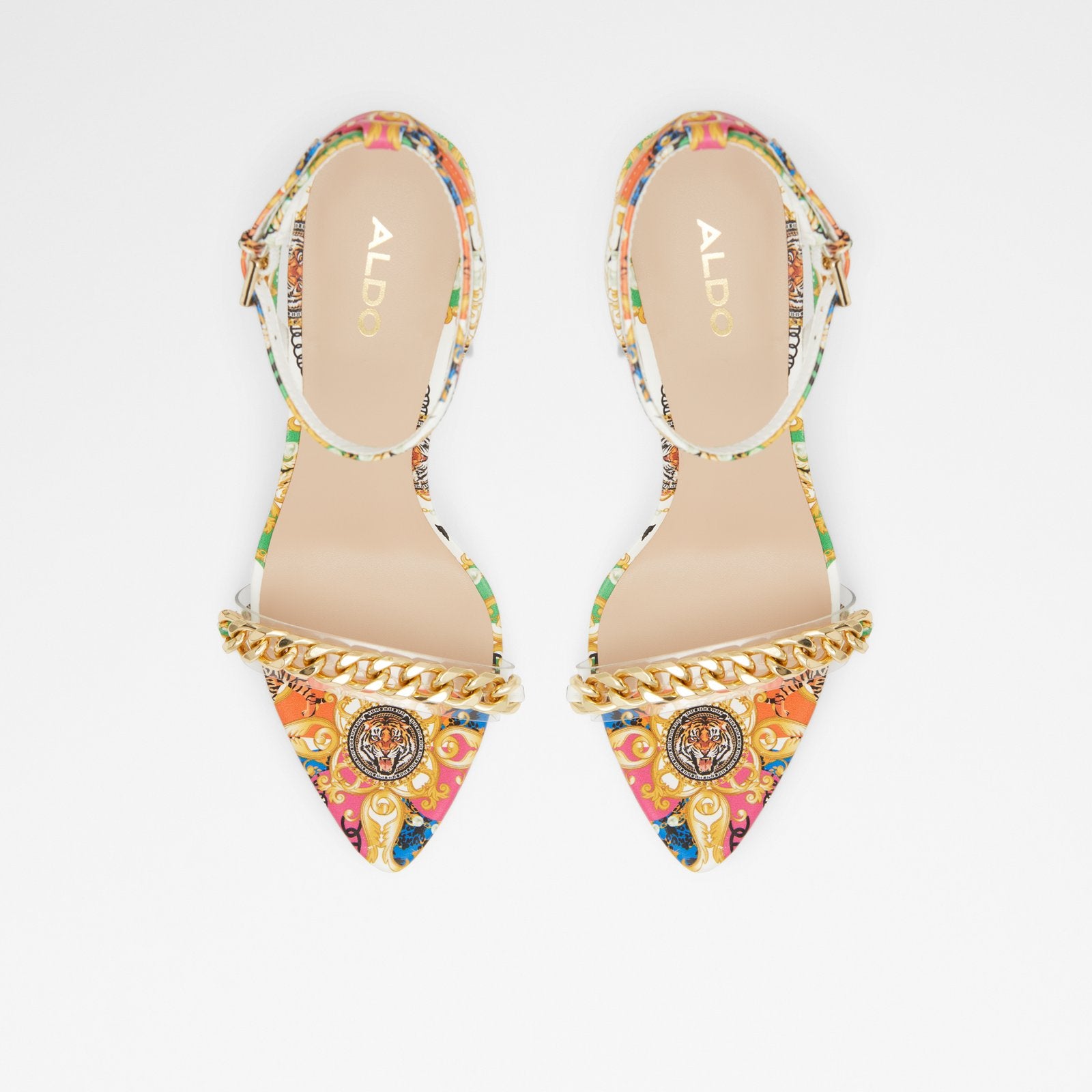 Feel vivacious in these pointy toe stilletos secured at the ankle with a delicate strap. A frisky print and timeless silhouette is elevated with a luxe chain detail.
