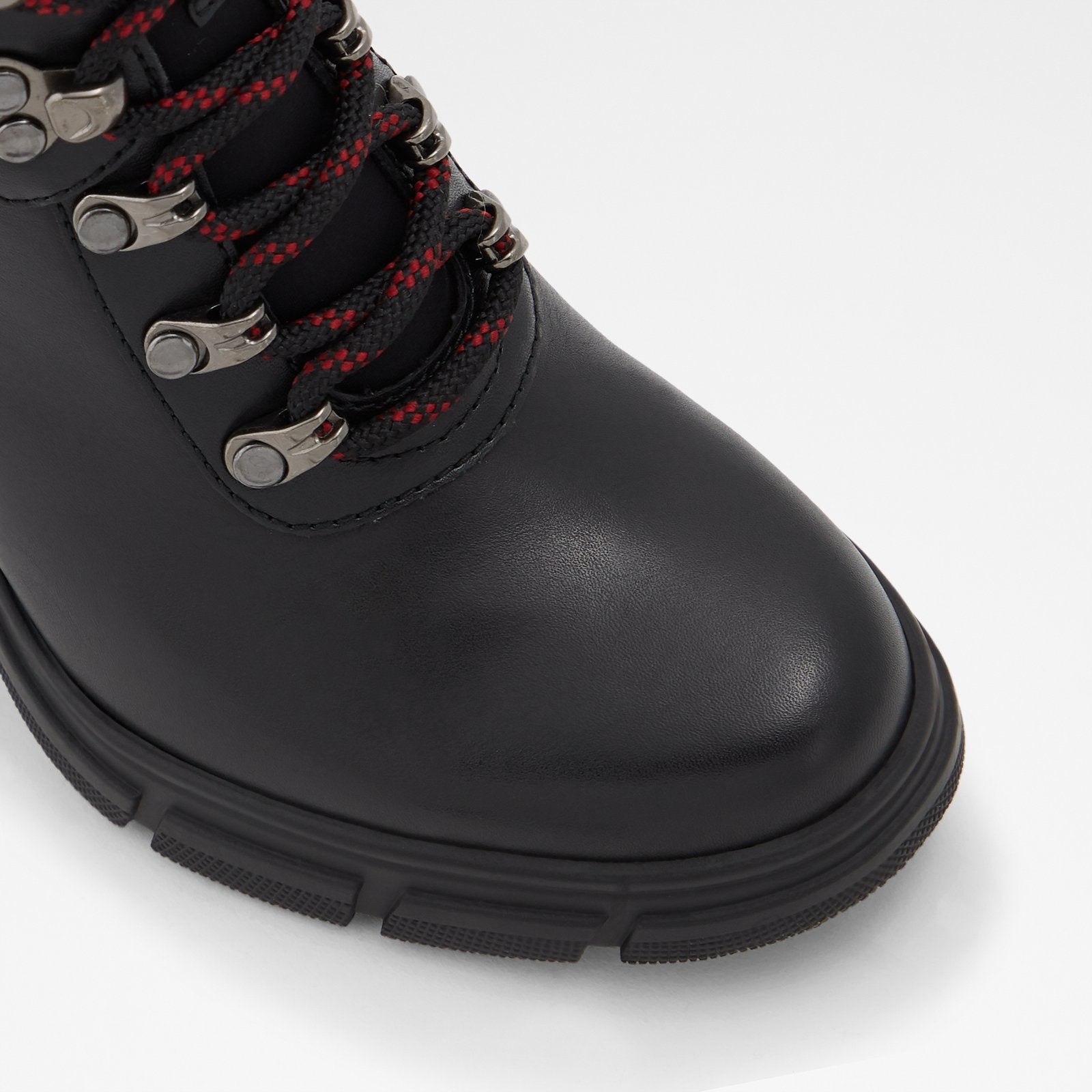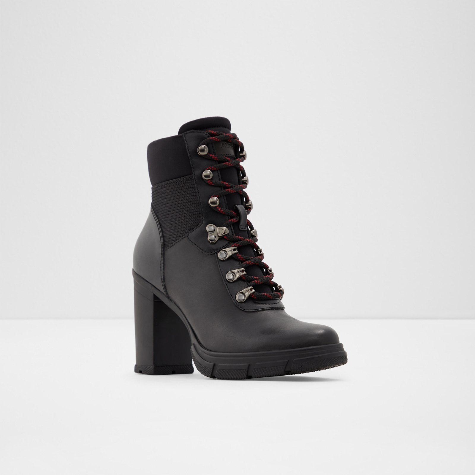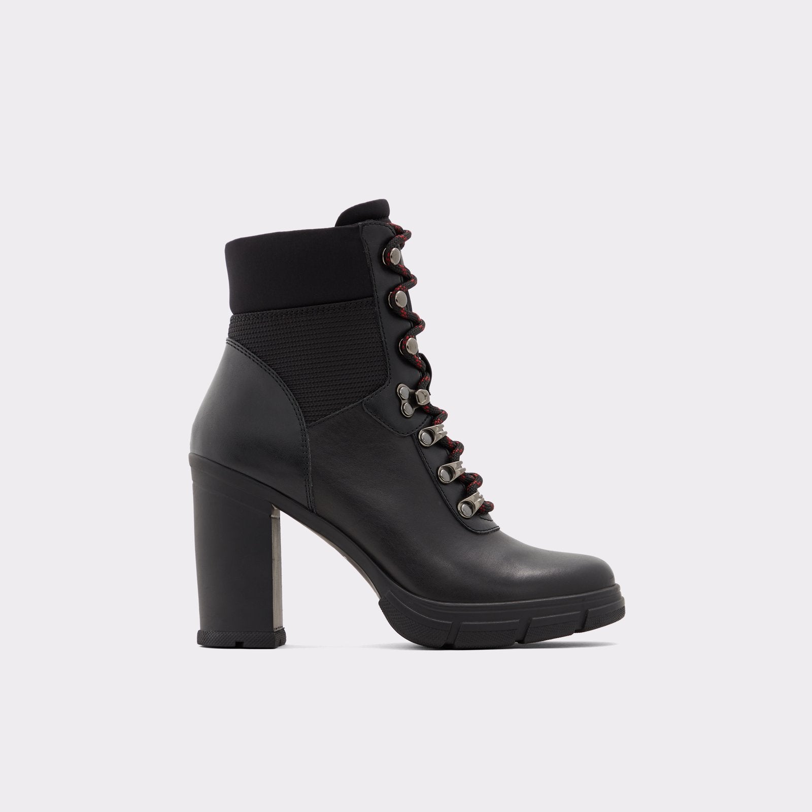Stepping in line with the season's utilitarian trend, this lace-up ankle boot commands attention. It's set on a thick high-heel and treaded rubber sole, that grips on any terrain.