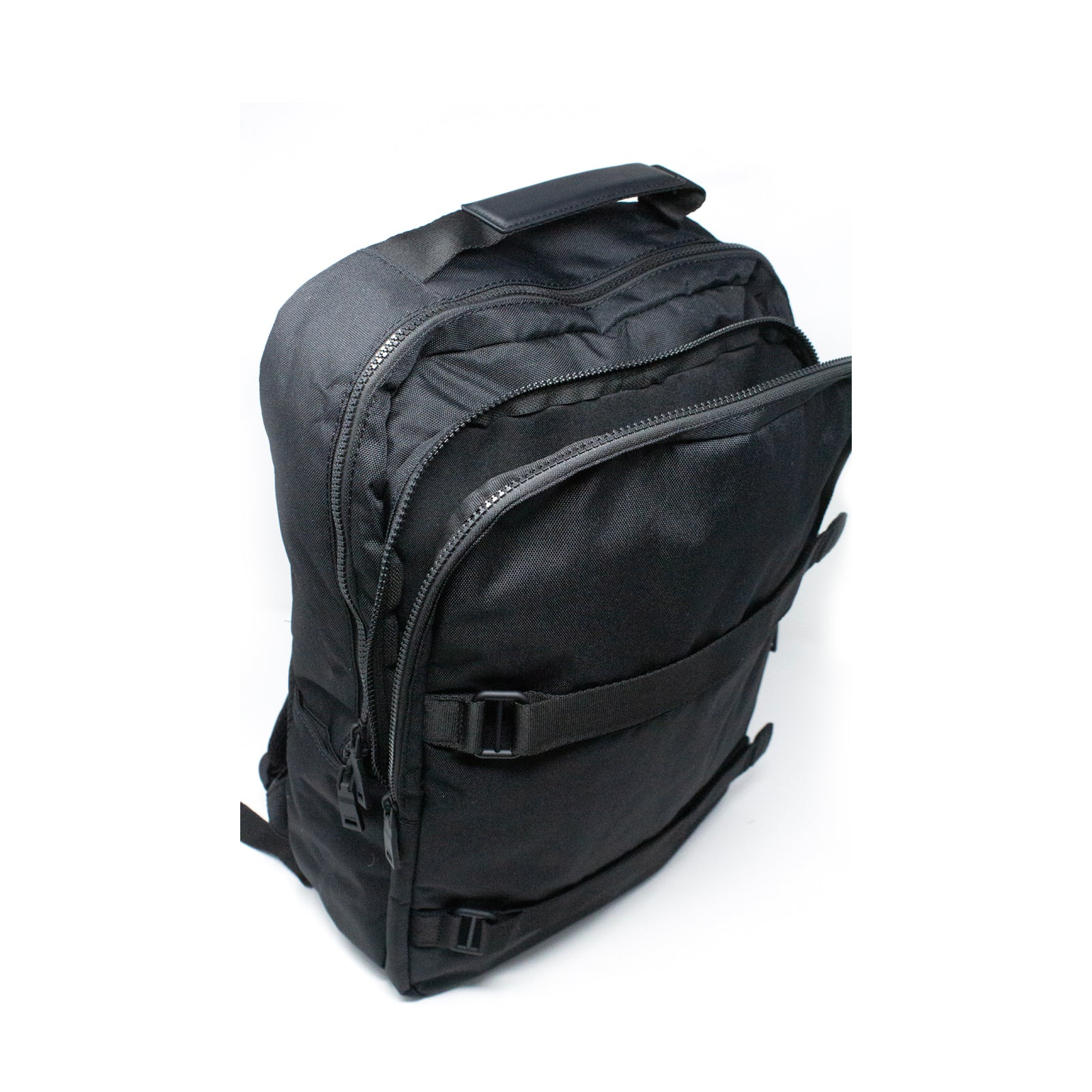 Mens large size backpack with non-removeable functional skateboard webbing strap attachment and multiple pocket detailing. Comes with back travel sleeve.